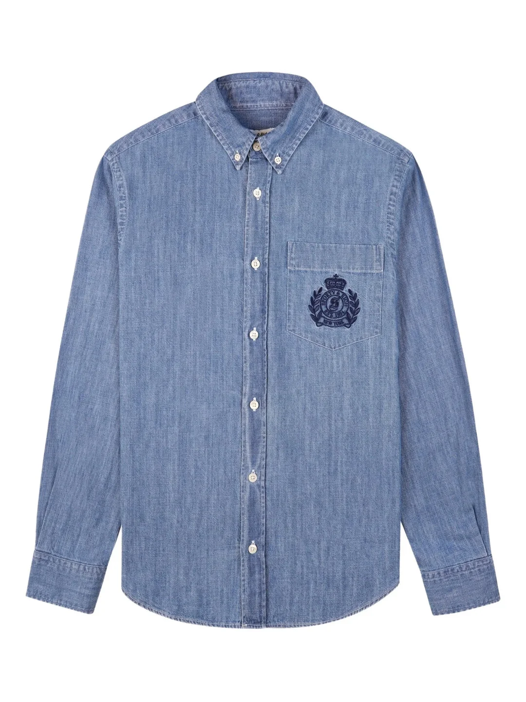 The Sporty & Rich NY Crest Oversized Denim Shirt delivers contemporary streetwear with collegiate-inspired branding and relaxed sophistication. Crafted from premium washed denim in classic blue wash, featuring an embroidered NY crest logo on the chest pocket and traditional button-down construction. The oversized fit and vintage-inspired details create a versatile wardrobe staple that bridges casual and refined styling.