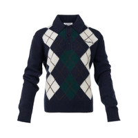 300050587NVY-LL / E6WS07462300BL106/00/3902 - 100% cashmere construction - Classic polo collar with button placket - Long sleeves with ribbed cuffs - Argyle diamond pattern in contrasting colors - Serif logo branding - Ribbed hem - Regular fit The Sporty & Rich Serif Logo Argyle Cashmere Polo delivers preppy luxury with premium cashmere construction and signature argyle patterning. Crafted from soft cashmere knit in navy with contrasting cream and forest green diamond motifs, featuring a classic polo collar and button placket. The timeless argyle design and refined cashmere blend create an elevated take on classic country club style.