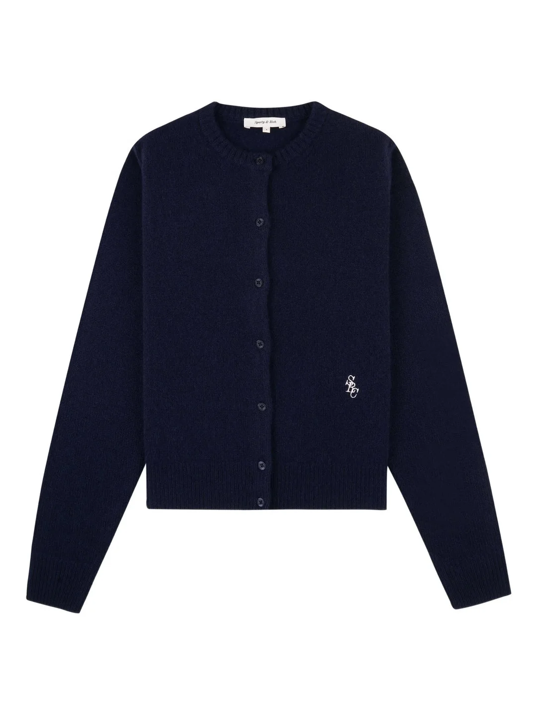 300050585NVY-XS / E6WS07364302BL106/00/3902 - 100% premium cashmere construction - Button-front closure - Ribbed neckline, cuffs, and hem - Embroidered SRC logo detail - Long sleeves - Regular fit The Sporty & Rich SRC Cashmere Cardigan delivers luxurious warmth with minimalist athletic-inspired design. Crafted from premium cashmere in deep navy, featuring a classic button-front closure and ribbed trim detailing. The signature SRC embroidered logo adds understated brand recognition to this versatile layering essential.
