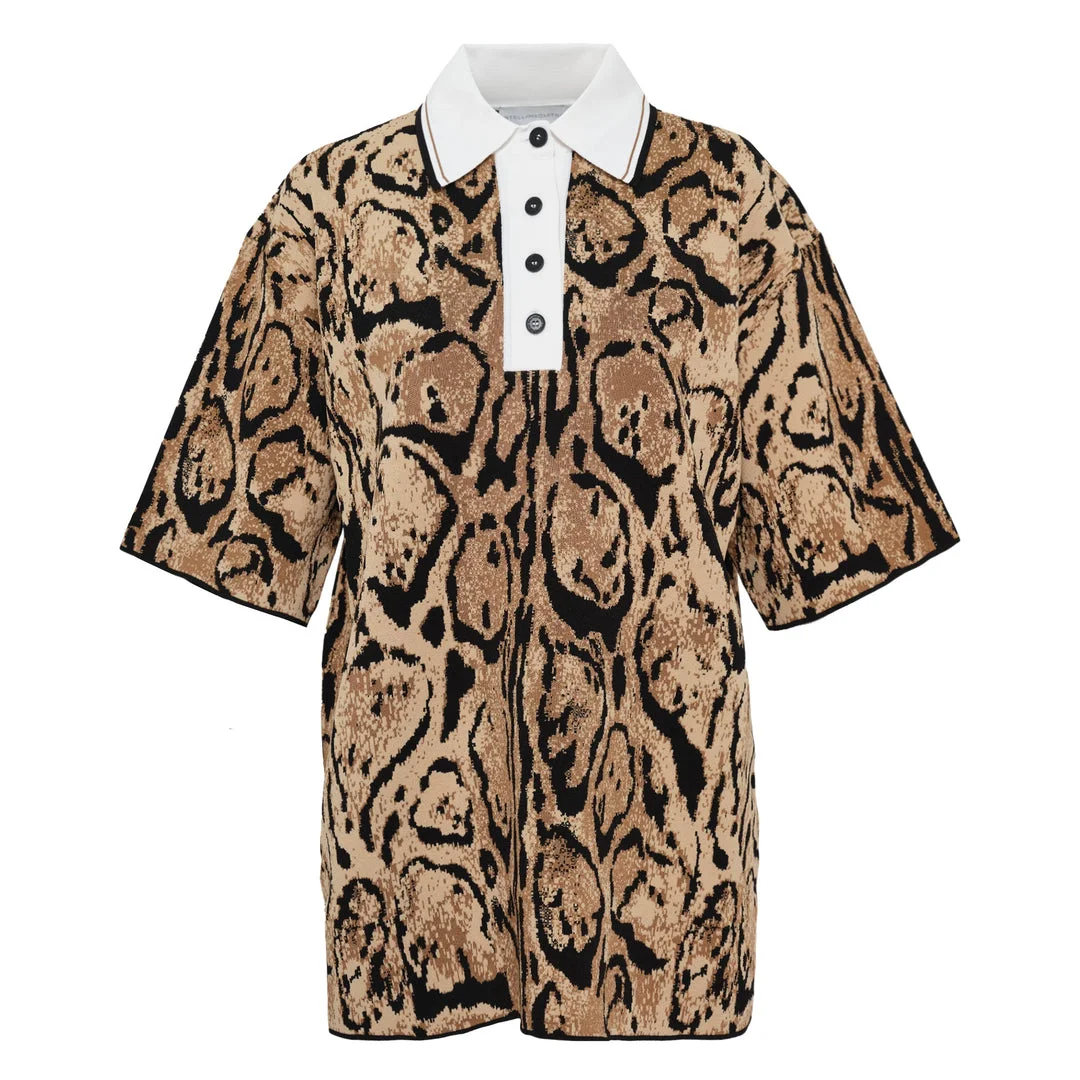 600076724ANP0XS / PS26-6K1162/3S2617/8490 - Leopard print knit construction - Contrasting white collar and button placket - Four-button front closure - Short sleeves - Relaxed oversized fit - Ribbed collar detailing Stella McCartney Cloud Leopard Polo delivers contemporary luxury with bold animal print styling and sophisticated construction. Crafted from premium knit fabric in rich brown leopard print with contrasting white collar and button placket. The oversized silhouette and signature McCartney aesthetic create a statement piece that elevates casual luxury dressing.