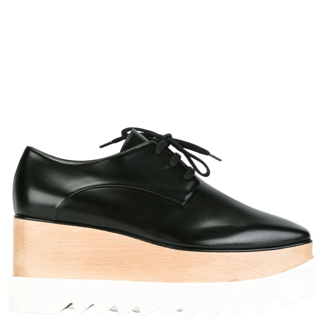 Stella McCartney Elyse Lace Up Flatforms There's no need to stand on your tiptoes anymore, as in these Elyse Lace Up Flatforms you'll be towering above the rest. These black flatforms are wonderfully versatile, don for instant elongated pins. Wear them with a maxi dress and Falabella bag or to elevate a two-piece tailored suit. - Upper 60% Polyurethane, 40% Polyester / Sole 100% Rubber - 80mm platform - Black - Angular square toe - Lace-up fastening - Fully lined - Brand embossed insole - Beech wood wedge heel - Saw-edge micro sole