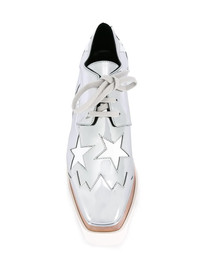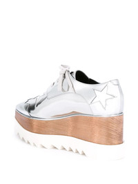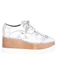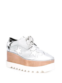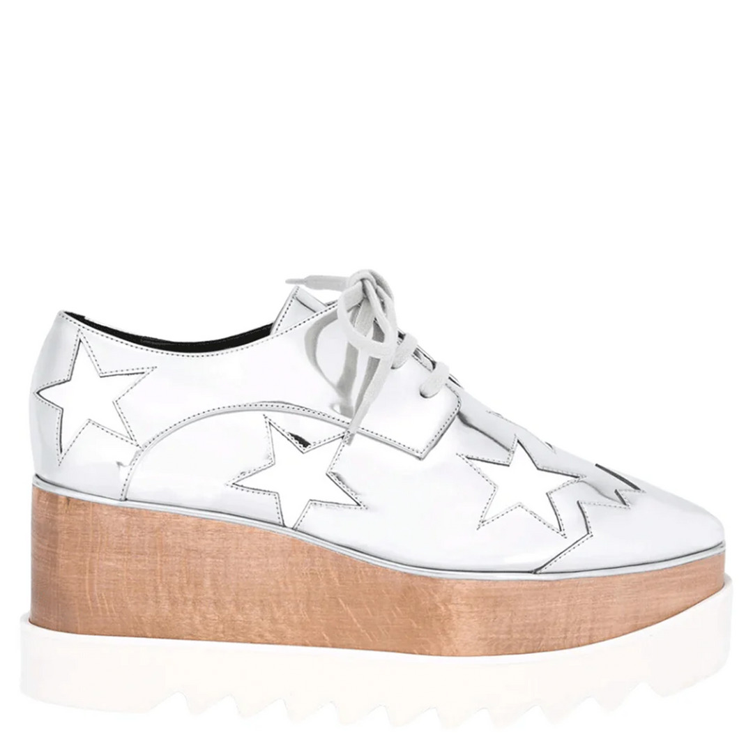Stella McCartney Elyse Stars Mirror Lace Up Flatform Elevate your fashion game to celestial heights with the Stella McCartney Elyse Stars Mirror Lace up Flatforms. Unleashing your stellar style, the mirror design adds a touch of cosmic charm. With a pair, step into the spotlight and shine with every stride. - Artificial leather - Silver - Derby-style shoes - Wooden platform with contrast chunky sole - Rubber sole
