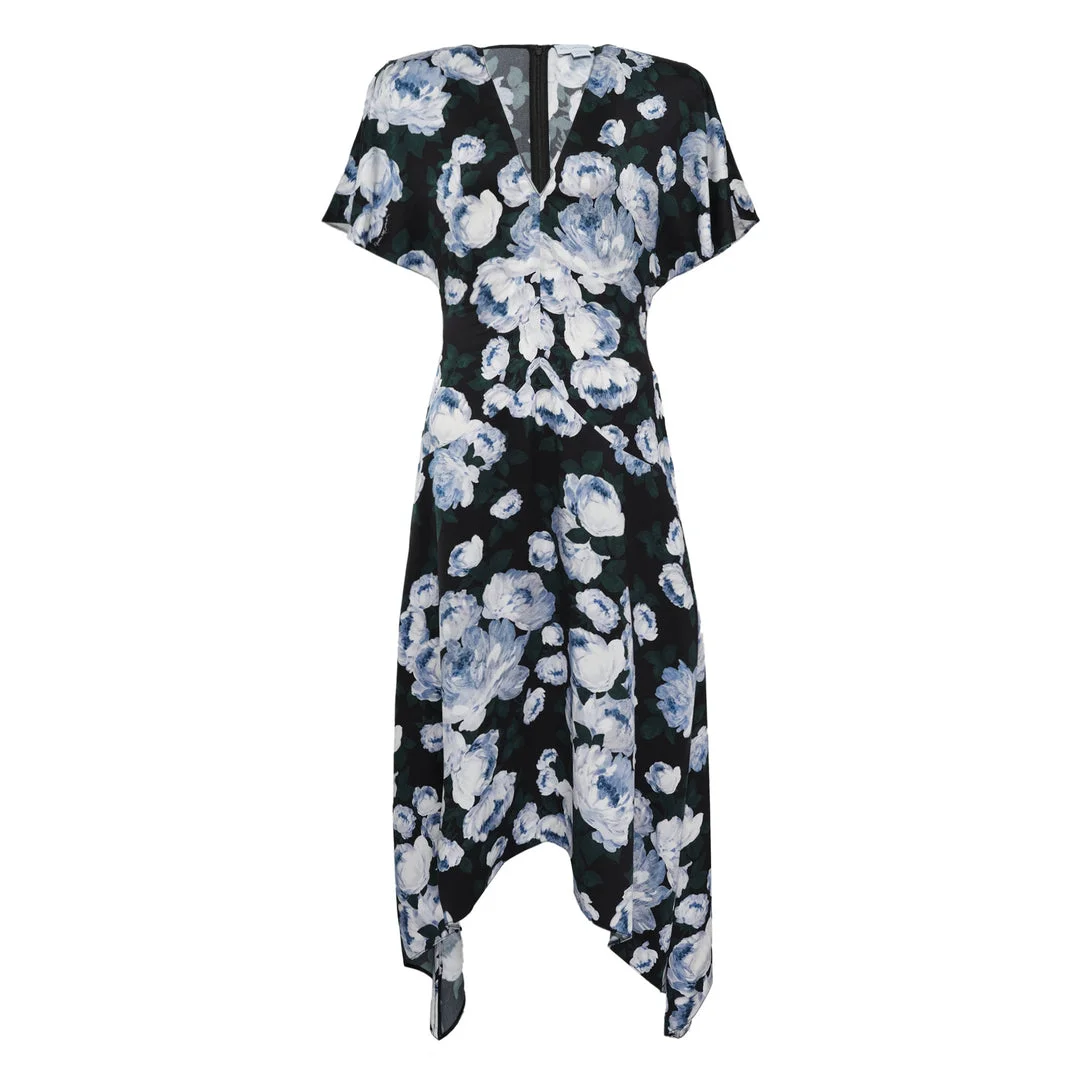 600076704FLR036 / PS26-6A0657/3HS335/8485 - V-neckline with subtle keyhole detail - Short flutter sleeves - Asymmetrical handkerchief hemline - All-over blue floral print on black base - Envers satin construction - Flowing A-line silhouette - Midi length The Stella McCartney Envers Satin V Neck Dress delivers feminine elegance with contemporary sophistication and sustainable luxury craftsmanship. Crafted from lustrous envers satin in a romantic blue floral print against black, featuring a flattering V-neckline and flowing asymmetrical hemline. The short sleeves and fluid silhouette create an effortlessly chic piece perfect for special occasions and elevated everyday wear.