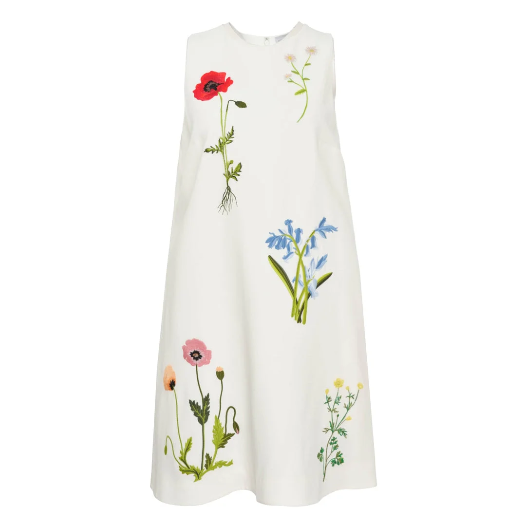 600076702OWT034 / PS26-6A0638/3FU372/9200 - Sleeveless A-line silhouette - Round neckline - Hand-embroidered wildflower motifs - Back zip closure - Midi length - Sustainable fabric construction - Relaxed fit Stella McCartney Flower Embroidered Dress delivers botanical elegance with sustainable luxury craftsmanship. Made from premium eco-friendly fabric in crisp white, featuring intricate embroidered wildflowers including poppies, daisies, and bluebells throughout. The signature botanical motifs and contemporary silhouette create a refined statement piece for conscious luxury wardrobes.