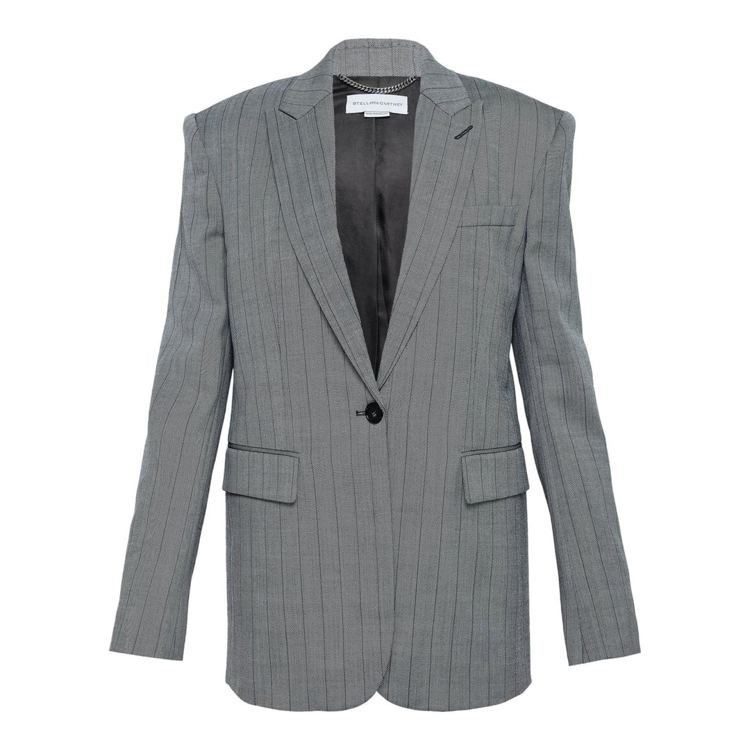 600073949GRY036 / AW25-650139/3GR650/1202 - Single-button closure - Notched lapels - Structured shoulder construction - Front flap pockets - Pinstripe pattern throughout - Tailored fit - Full lining The Stella McCartney Pinstripe Jacket delivers contemporary tailoring with sustainable luxury craftsmanship. Constructed from premium grey pinstripe suiting fabric with structured shoulders and clean lines, featuring a single-button closure and notched lapels. The sharp silhouette and sophisticated pinstripe pattern create a powerful statement piece for modern professional wardrobes.