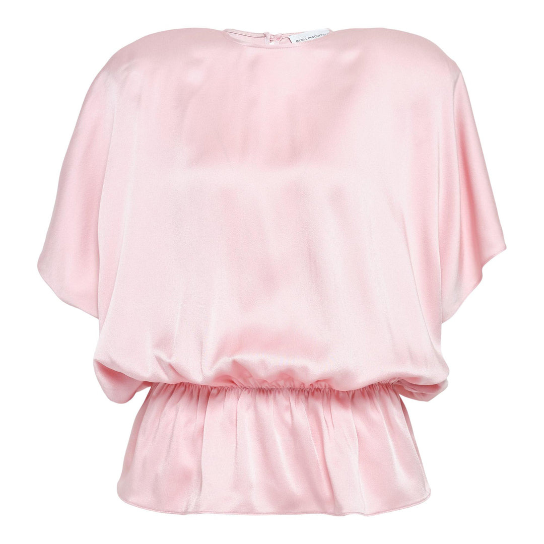 600073969PNK038 / AW25-6T0269/3FU302/5650 - Premium satin construction - Kimono-style short sleeves - Elasticated waistband - Relaxed fit through body - Round neckline - Draped silhouette - Button closure at back neck The Stella McCartney Satin Top delivers effortless luxury with a contemporary draped silhouette perfect for elevated casual or formal styling. Crafted from premium satin in soft pink, featuring kimono-style short sleeves and an elasticated waistband for comfort and fit. The fluid draping and lustrous finish create a sophisticated statement piece that embodies the brand's modern feminine aesthetic.