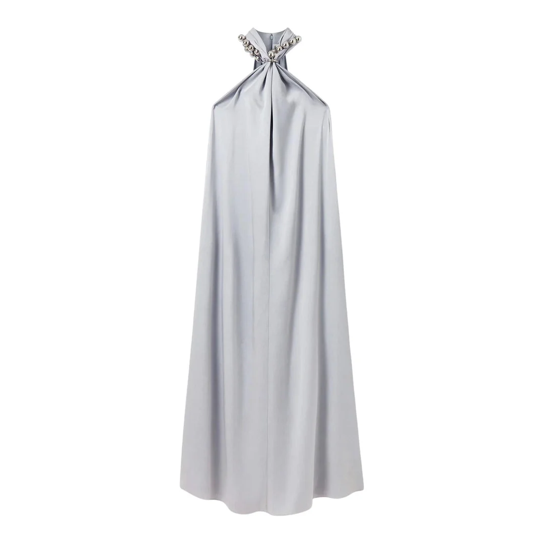 600071294LBL040 / PF25-6A0557/3FU302/4905 - Halter neckline with sphere embellishments - Sleeveless design - Floor-length silhouette - Fluid draping construction - Back neck closure - Relaxed fit through body The Stella McCartney Sphere Embellished Gown delivers sophisticated elegance with contemporary design and luxurious detailing. Crafted from fluid silk-like fabric in refined silver-gray, featuring distinctive sphere embellishments at the halter neckline for modern glamour. The graceful draping and sleek silhouette create a striking statement piece for special occasions.
