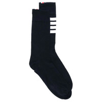 Thom Browne 4 Bar Mid Calf Socks Made from soft, crisp fabric, these socks are finished with the signature 4-Bar Stripe and grosgrain loop tab. - 75% Cotton, 25% Nylon - Black - Signature 4-Bar stripe - Signature grosgrain loop tab - Stretch-design - Knitted construction - Ankle-length - Made in the United Kingdom