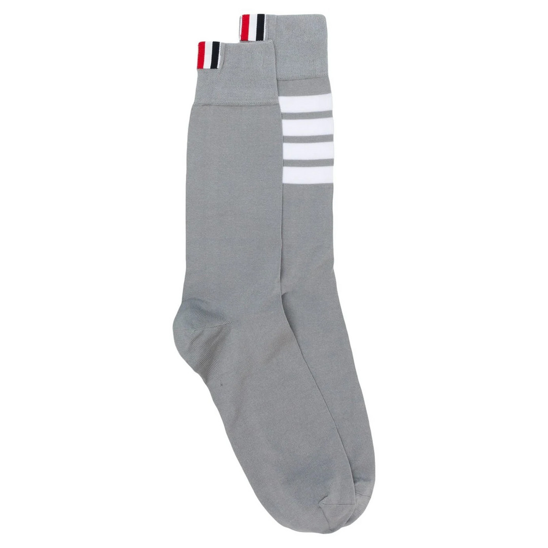 Thom Browne 4 Bar Mid Calf Socks Made from soft, crisp fabric, these socks are finished with the signature 4-Bar Stripe and grosgrain loop tab. - 75% Cotton, 25% Nylon - Grey - Signature 4-Bar stripe - Signature grosgrain loop tab - Stretch-design - Knitted construction - Ankle-length - Made in United Kingdom