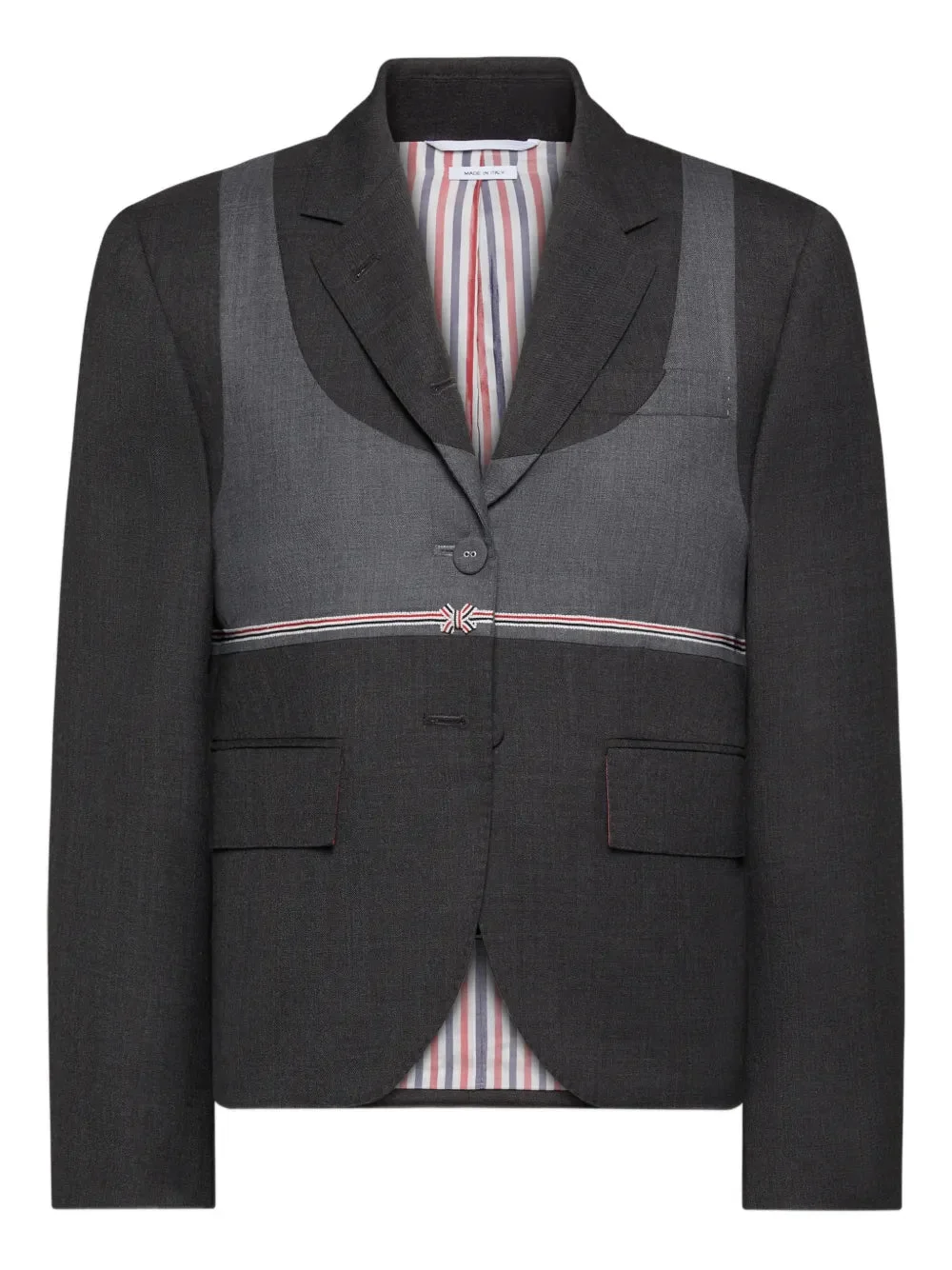 600077645GRY040 / PS26-FBC954C-00626/00/025 - Three-button front closure - High armhole construction - Trompe-l'oeil visual layering effect - Signature tricolor stripe detailing - Premium wool suiting construction - Notched lapels - Multiple interior pockets - Tailored fit The Thom Browne Bikini Trompe Loeil High Armhole delivers avant-garde tailoring with playful optical illusion design elements. Crafted from premium wool suiting in charcoal gray, featuring the brand's signature trompe-l'oeil detailing that creates visual interest through clever layering effects. The high armhole construction and signature tricolor striping showcase Thom Browne's innovative approach to menswear tailoring.