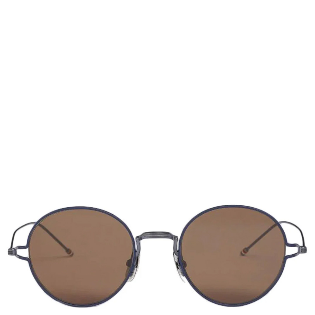Thom Browne Black Iron Navy Enamel Eyewear - 100% Titanium - Lens Width: 50 mm / Nose Bridge Length: 21 mm / Temple Length: 145 mm - Black - Brown Round Shaped Sunglasses - Titanium Front Frame - Titanium Brow Bar - Titanium Bridge Piece - Custom Split Hinge - 4-Bar Titanium Nose Pads Detail - Tri-Color Temple Tips - 100% UVA and UVB Protection - Anti-Reflective Coating