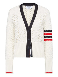 600068967WHT036 / AW25-FKC675B-Y1024/00/100 - 100% merino wool construction - Cable pointelle stitch pattern - Button-front closure with four buttons - Contrasting charcoal trim at neckline and button band - Signature 4-bar stripe detail on left sleeve - Ribbed cuffs and hem - Classic fit - V-neck design Thom Browne Cable Pointelle Merino Wool Cardigan delivers sophisticated preppy elegance with signature brand detailing and premium construction. Crafted from fine merino wool in classic white with contrasting charcoal trim and iconic 4-bar stripe detailing on the sleeve. The cable knit pointelle stitch pattern and classic button-front closure create a timeless piece that embodies Thom Browne's refined aesthetic.