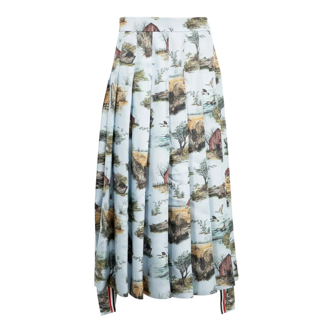 600068810MLT040 / PF25-FGCA24U-F0975/00/996 - Classic box pleats at back - Countryside toile print throughout - Tri-color grosgrain ribbon hem detail - Side zip closure - Calf-length cut - Premium cotton construction - A-line silhouette The Thom Browne Calf Length Classic Back Pleated Skirt delivers sophisticated tailoring with signature preppy elegance and timeless femininity. Crafted from premium cotton with whimsical countryside toile print in soft blue tones, featuring classic box pleats and structured silhouette. The iconic tri-color grosgrain ribbon trim at the hem provides the brand's distinctive finishing touch.