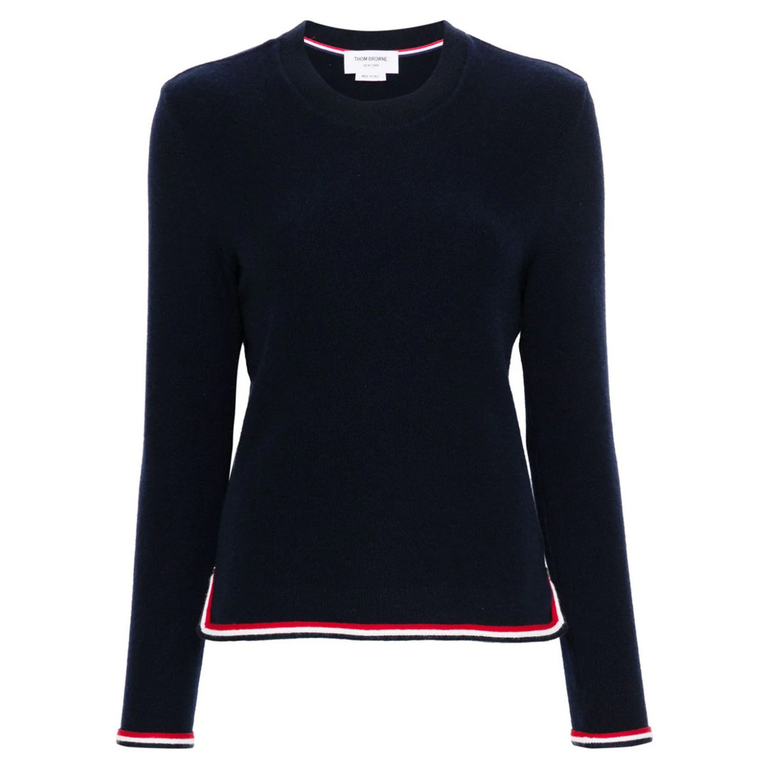 600060081NVY044 / PS25-FJS180A-J0169/00/415 - 100% cashmere construction - Crew neckline - Long sleeves - Signature tricolor striped trim - Ribbed cuffs and hem - Regular fit The Thom Browne Cashmere Long Sleeve Top delivers luxurious comfort with the brand's signature preppy aesthetic. Crafted from premium cashmere in navy with contrasting tricolor striped trim at neckline, cuffs, and hem. The signature red, white, and blue detailing creates a refined collegiate look that defines modern American luxury.