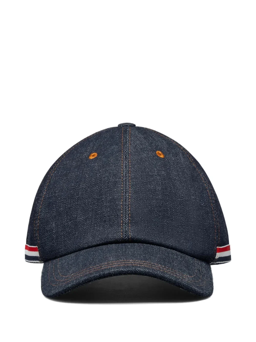600077591NVY00L / PS26-MHC328S-F1101/00/415 - Six-panel structured construction - Adjustable back closure - Signature tricolor grosgrain stripe detail - Premium denim fabric - Contrast topstitching throughout - Classic curved visor - Ventilation eyelets The Thom Browne Classic 6 Panel Baseball Cap delivers refined American sportswear with signature preppy sophistication. Crafted from premium denim fabric in deep navy blue, featuring the brand's iconic tricolor grosgrain stripe detailing. The structured six-panel construction and contrast stitching create a timeless accessory that elevates casual styling.