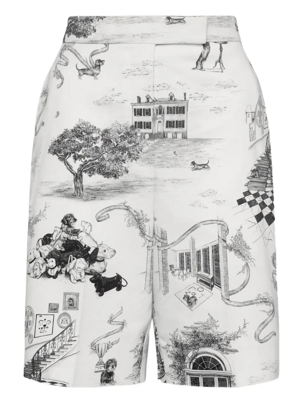 600077681WHT038 / PS26-FTC508U-F1111/00/980 - Elasticated waistband with drawstring closure - Classic bermuda length - Signature Thom Browne toile print featuring American scenes - Premium cotton twill construction - Monochromatic black and white colorway - Regular fit through thigh and knee - Narrative illustrations throughout fabric Thom Browne Classic Backstrap Bermuda Shorts deliver preppy sophistication with signature Americana storytelling through whimsical toile prints. Crafted from premium cotton twill featuring iconic illustrations of buildings, dogs, and classic American scenes in monochromatic black and white. The structured tailoring and distinctive narrative print create a playful yet refined statement piece that embodies the brand's subversive take on traditional menswear.