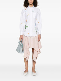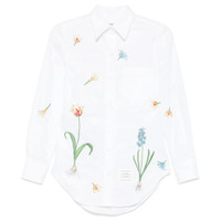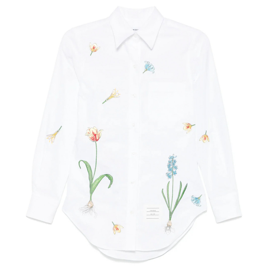 600060062WHT038 / PS25-FLL005E-E1246/00/100 - Hand-illustrated botanical print - Classic point collar - Long sleeves with barrel cuffs - Button-front closure - Premium cotton poplin construction - Regular fit - Curved hem The Thom Browne Classic Flowers And Buds Shirt delivers refined elegance with signature botanical artistry and traditional tailoring. Crafted from premium cotton poplin in crisp white, featuring hand-illustrated wildflower motifs including tulips and blue hyacinth scattered across the fabric. The classic point collar and structured silhouette showcase Thom Browne's mastery of traditional shirting with artistic sophistication.