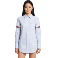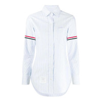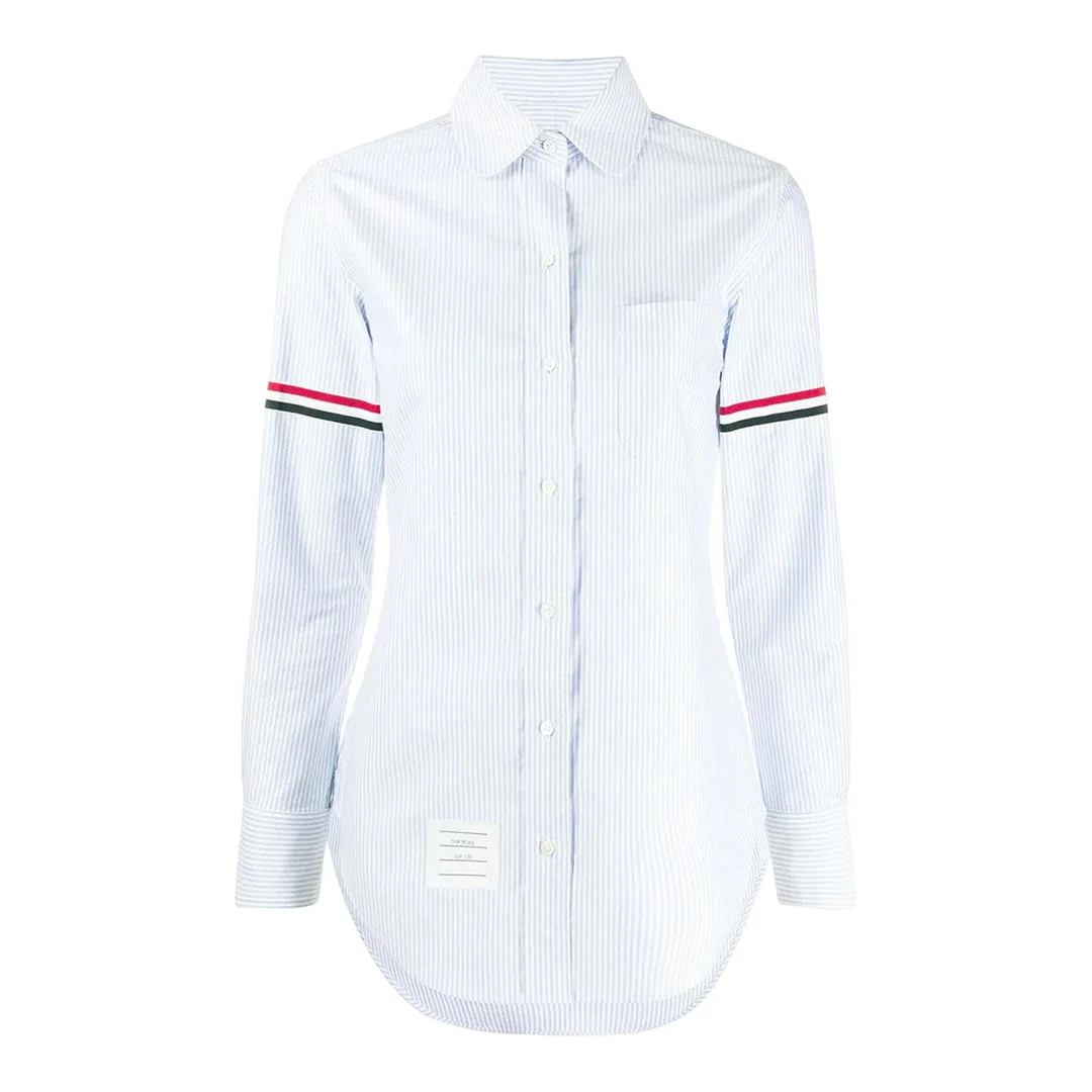 600001793LBL036 / FLL019E-00098/00/480 - Fine blue pinstripe pattern - Tricolor grosgrain tape sleeve detail - Classic point collar - Button-front closure - Long sleeves with barrel cuffs - Chest pocket - Premium cotton construction - Regular fit Thom Browne Classic Long Sleeve Shirt delivers refined American tailoring with signature preppy sophistication. Crafted from premium cotton with fine blue pinstripes on crisp white ground, featuring the brand's iconic tricolor sleeve detailing. The precise construction and signature four-bar stripe accent create a timeless wardrobe essential with contemporary edge.
