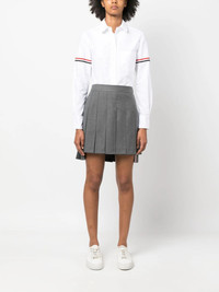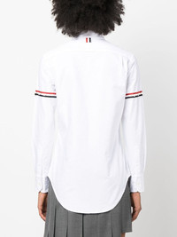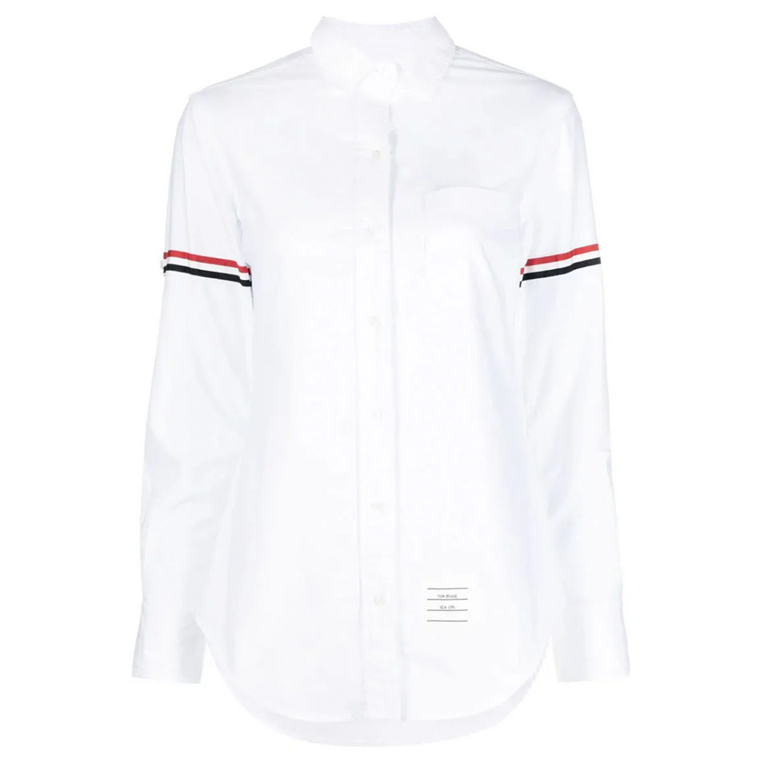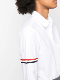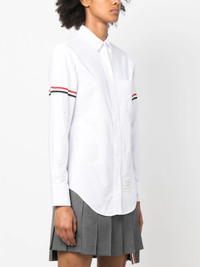 Thom Browne Classic Round Collar Shirt The Classic Round Collar Shirt showcases the RWB stripe armbands, exhibiting Thom Browne's signature style. Cut in tailored fit, it is adorned with a front logo patch, embodying brand's commitment to timeless sophistication infused with innovative details. - 100% Cotton - White - Classic collar - Long sleeves - RWB stripe armbands - Logo patch to the front - Signature grosgrain loop tab - Front button fastening - Chest patch pocket - Curved hem - Hem hits below hips - Tailored fit