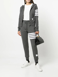 600000590CHA036 / FJQ001A-00535/00/025 - Elasticated waistband with drawstring closure - Signature four-bar stripe detail on left thigh - Ribbed cuffs and hem - Side seam pockets - Cotton blend fleece construction - Relaxed fit with tapered leg - Branded label at ankle Thom Browne Classic Sweatpants deliver refined athleticwear with signature preppy sophistication and tailored comfort. Crafted from premium cotton blend fleece in medium gray melange, featuring the brand's iconic four-bar stripe detail on the left thigh. The relaxed fit with tapered leg and ribbed cuffs creates a polished silhouette perfect for elevated casual wear.