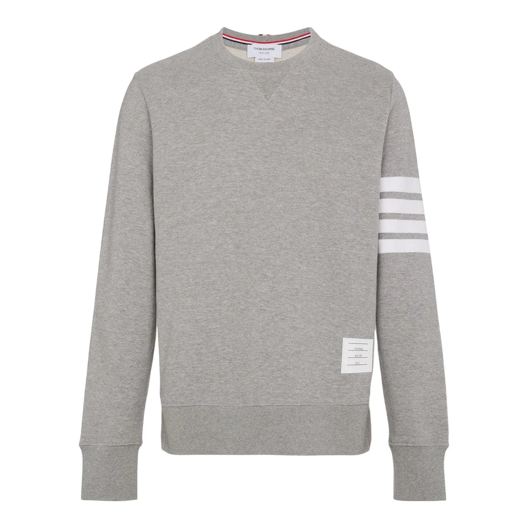 600000549LGY000 / MJT021H-00535/00/068 - Crew neckline with ribbed collar - Signature four-bar stripe detail on left sleeve - Long sleeves with ribbed cuffs - Ribbed hem - Premium cotton fleece construction - Regular fit - Embossed logo patch at hem Thom Browne Classic Sweatshirt delivers premium comfort with signature tailoring excellence and refined athletic aesthetic. Crafted from premium cotton fleece in sophisticated light gray melange, featuring the brand's distinctive four-bar stripe detail on the left sleeve. The structured fit and luxury construction elevate casual wear with Thom Browne's iconic preppy sophistication.