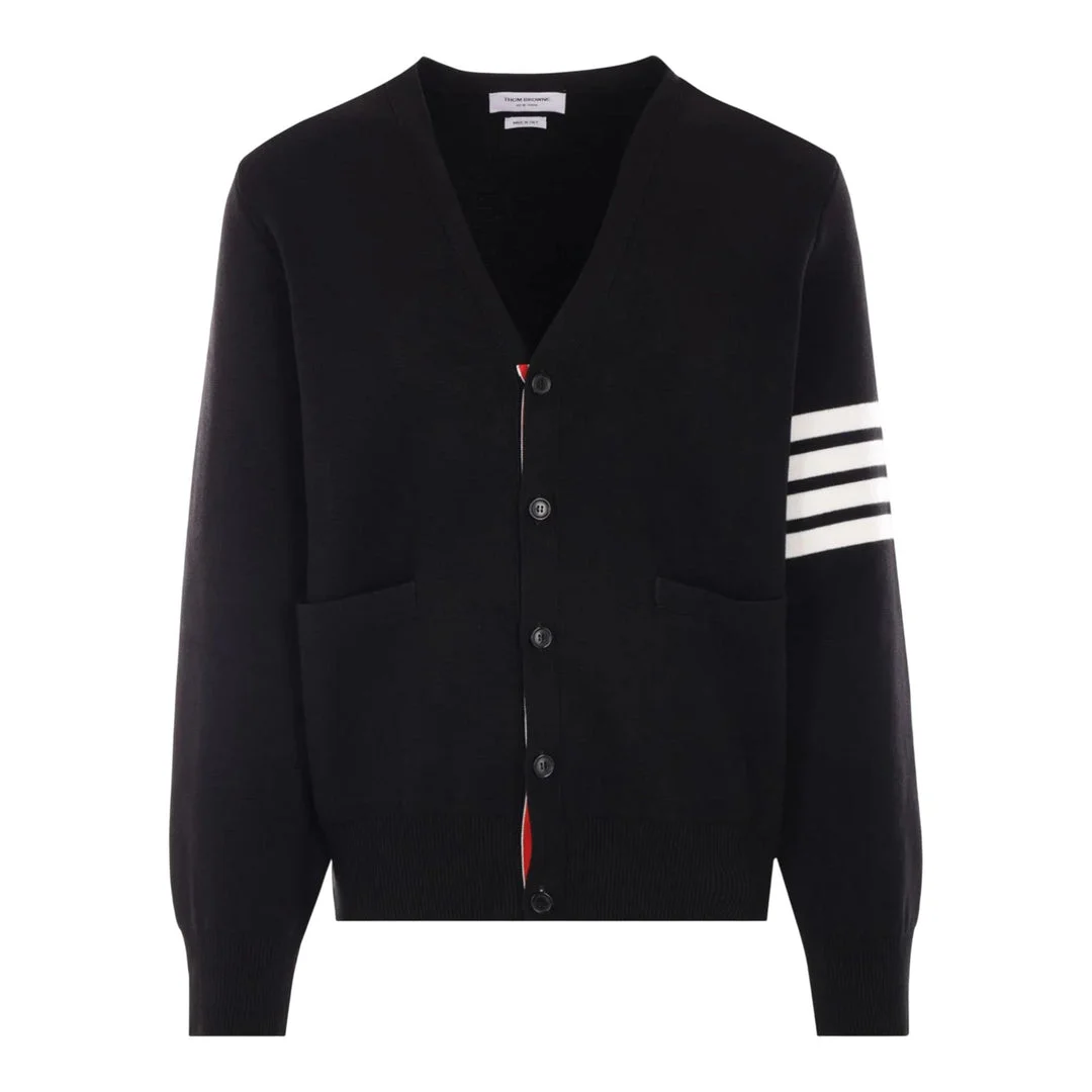 600001303BLK000 / MKC171A-00219/00/001 - Button-front closure - V-neckline - Signature four-bar stripe detail on sleeve - Two front patch pockets - Cotton crepe construction - Ribbed cuffs and hem - Regular fit The Thom Browne Cotton Crepe V-Neck Cardigan delivers sophisticated tailoring with the brand's signature preppy aesthetic. Crafted from premium cotton crepe in classic navy, featuring the iconic four-bar stripe detail and button-front closure. The structured fit and signature red, white, and blue accents create a refined piece that embodies Thom Browne's modern American luxury.