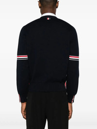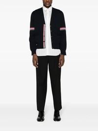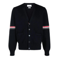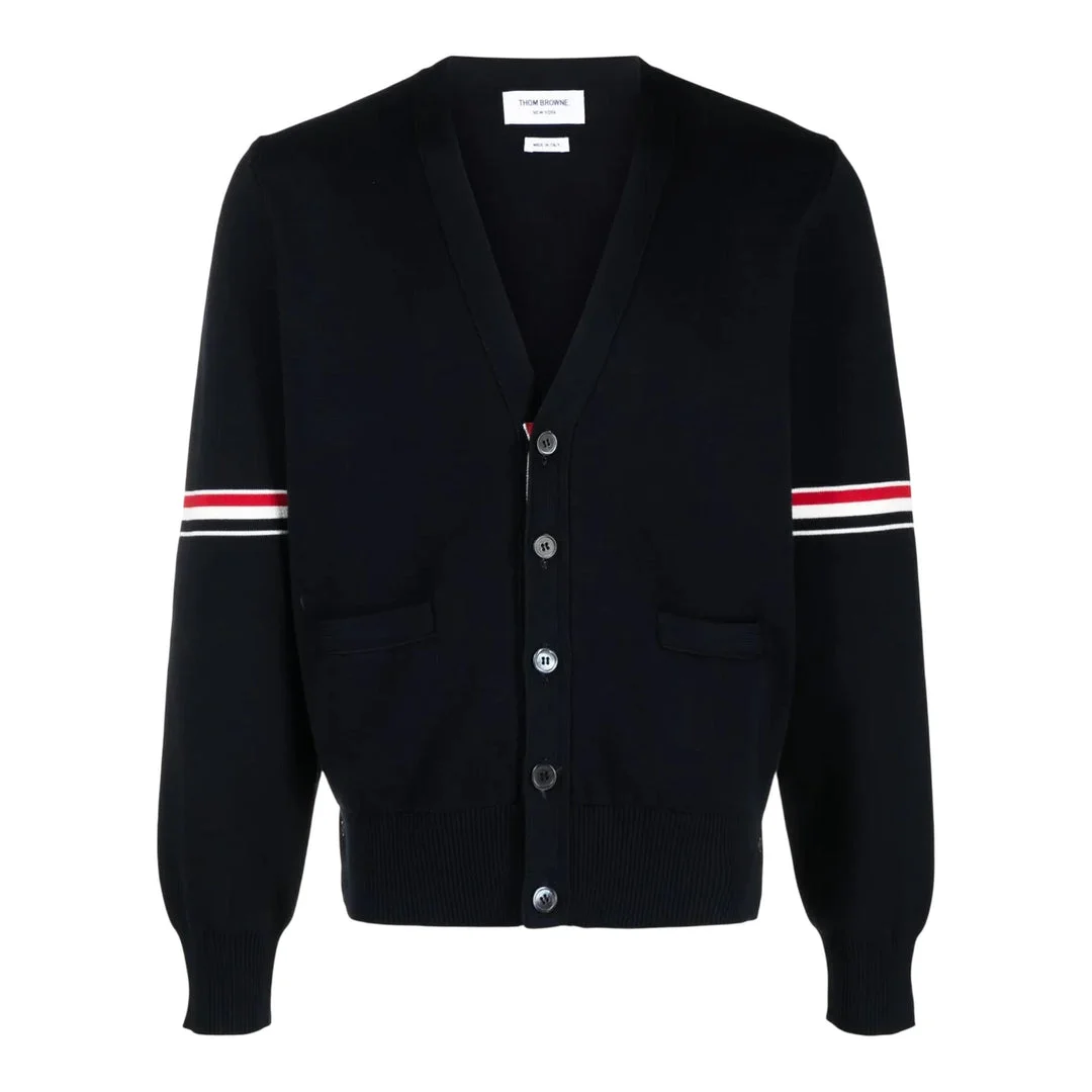 600000494NVY000 / B4MKC310A-Y3007/00/415 - Milano stitch cotton construction - Classic V-neckline - Five-button front closure - Signature tricolor sleeve stripes - Ribbed cuffs and hem - Two front patch pockets - Regular fit The Thom Browne Cotton Milano Stitch V-Neck Cardigan delivers American luxury with architectural tailoring and signature prep-school aesthetics. Crafted from premium Milano-stitch cotton in navy with distinctive varsity-inspired sleeve stripes in white, red, and black. The structured construction and iconic Thom Browne proportions create a sophisticated piece that bridges formal and casual wardrobes.