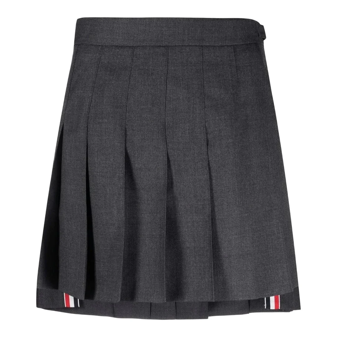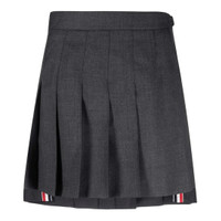 600001307CHA038 / FGC402V-00626/00/025 - High-waisted design with flat front panel - Knife-pleated construction throughout - Dropped back hemline - Signature tricolor grosgrain ribbon trim - Side zip closure - Mini length - Premium wool flannel construction - Structured fit The Thom Browne Dropped Back Pleated Mini Skirt delivers refined preppy elegance with signature architectural tailoring. Crafted from premium wool flannel in sophisticated charcoal grey, featuring knife-sharp pleats and the brand's iconic tricolor grosgrain ribbon trim. The dropped back hemline and structured pleating create a contemporary twist on classic schoolgirl chic.