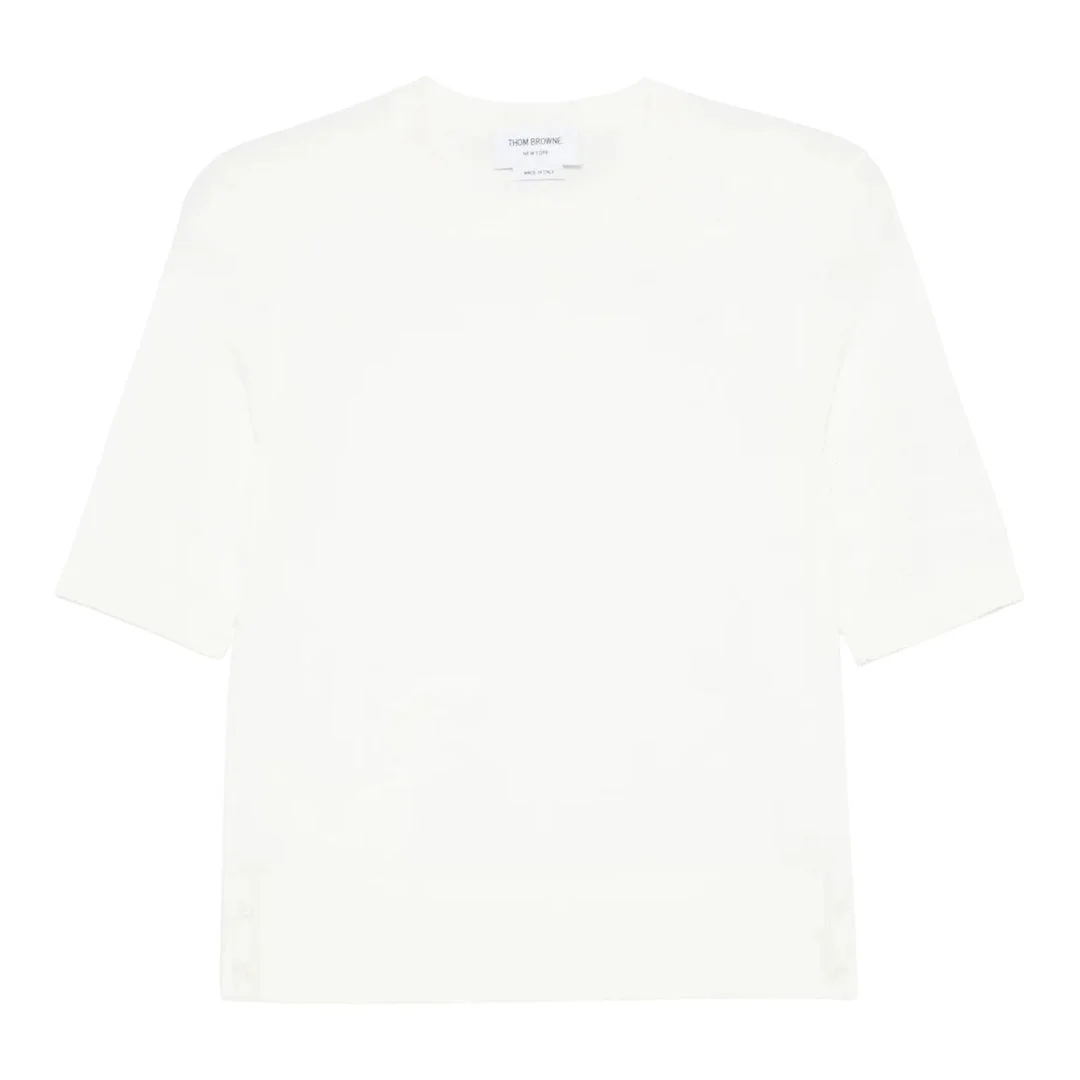 600068828WHT038 / PF25-FKA496A-Y3036/00/100 - Feather intarsia knit pattern - Pointelle construction - Signature 4-bar stripe detailing - Crew neckline - Short sleeves - Premium cotton blend fabric - Regular fit The Thom Browne Feather Intarsia Pointelle 4-Bar Tee delivers luxurious knitwear craftsmanship with sophisticated texture play and signature brand detailing. Crafted from premium cotton blend in classic white, featuring intricate feather intarsia pattern and delicate pointelle construction throughout. The iconic 4-bar stripe detailing and refined finishing elevate this piece as a statement essential for discerning wardrobes.