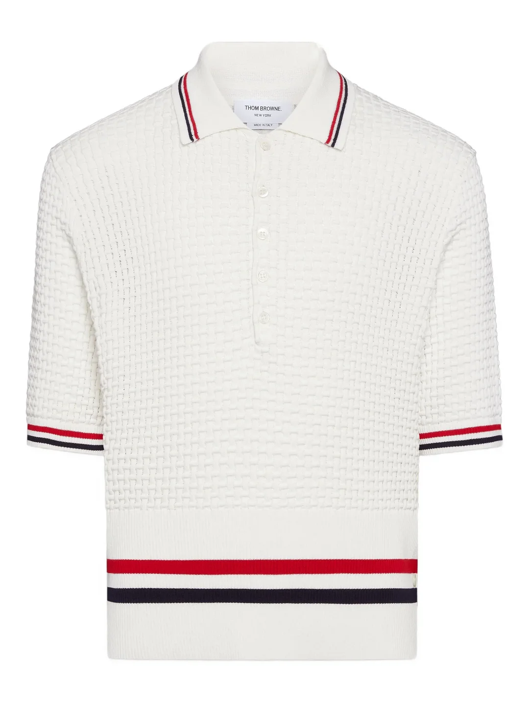300051791WHT-01 / E6MKP155A-Y3009/00/100 - Ripple stitch cotton construction - Classic polo collar with button placket - Signature tricolor stripe detailing - Short sleeves with striped cuffs - Ribbed hem with stripe accent - Regular fit The Thom Browne Float Ripple Stitch Classic Polo delivers sophisticated preppy elegance with signature textural craftsmanship. Crafted from premium cotton with distinctive ripple stitch construction in crisp white, featuring the iconic tricolor striping details at collar and sleeves. The structured knit texture and classic polo silhouette embody Thom Browne's refined American sportswear heritage.