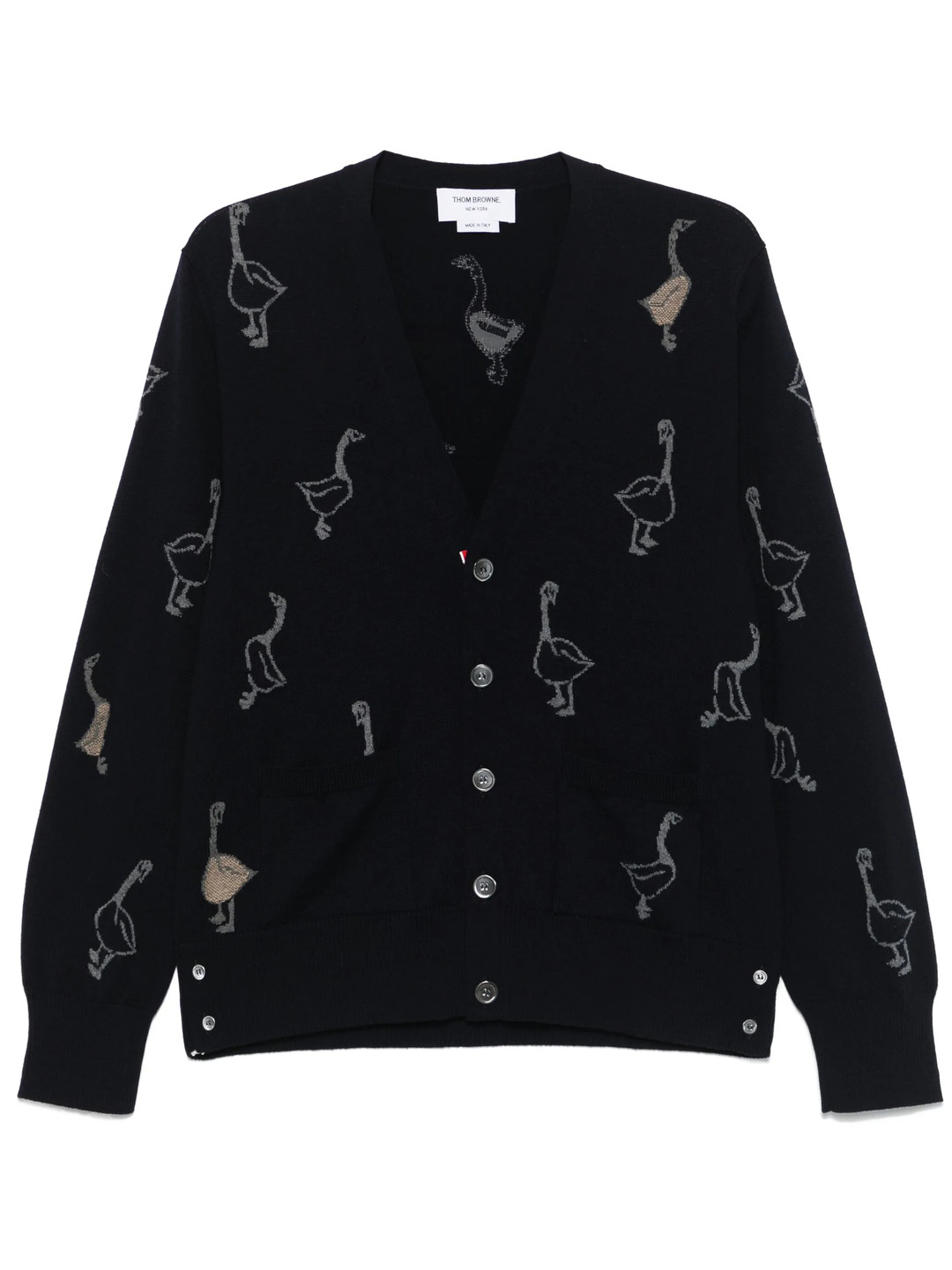 Thom Browne Geese Intarsia Merino Wool Relaxed Fit V Neck Cardigan Men