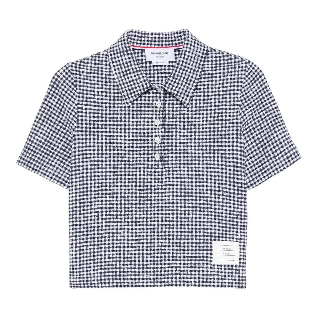 600068819NVY036 / PF25-FJP113A-J0222/00/415 - Classic polo collar with button placket - Short sleeves with ribbed cuffs - Cotton tweed construction - Navy and white gingham pattern - Cropped fit silhouette - Signature grosgrain trim details Thom Browne Gingham Cotton Tweed Polo delivers preppy sophistication with signature collegiate-inspired craftsmanship. Crafted from luxurious cotton tweed in classic navy and white gingham check, featuring the brand's iconic cropped silhouette. The structured tweed construction and signature grosgrain trim create a refined take on American sportswear.