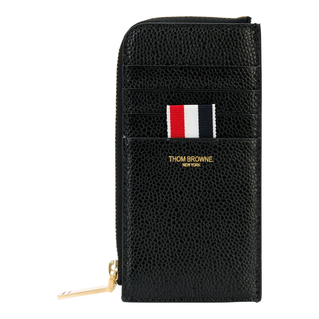 300039353BLK-NS / C4PF24-MAW080A-00198/00/001 - Premium pebbled black leather construction - Half zip-around closure with gold-tone hardware - Multiple card slots for organization - Signature tricolor ribbon detail - Compact wallet design - Thom Browne New York branding The Thom Browne Half Zip Around Wallet delivers sophisticated organization with signature New York craftsmanship and iconic tricolor detailing. Crafted from premium pebbled black leather with multiple card slots and compartments, featuring the brand's distinctive red, white, and navy ribbon accent. The half-zip closure and structured silhouette create a refined accessory that embodies Thom Browne's classic American luxury aesthetic.