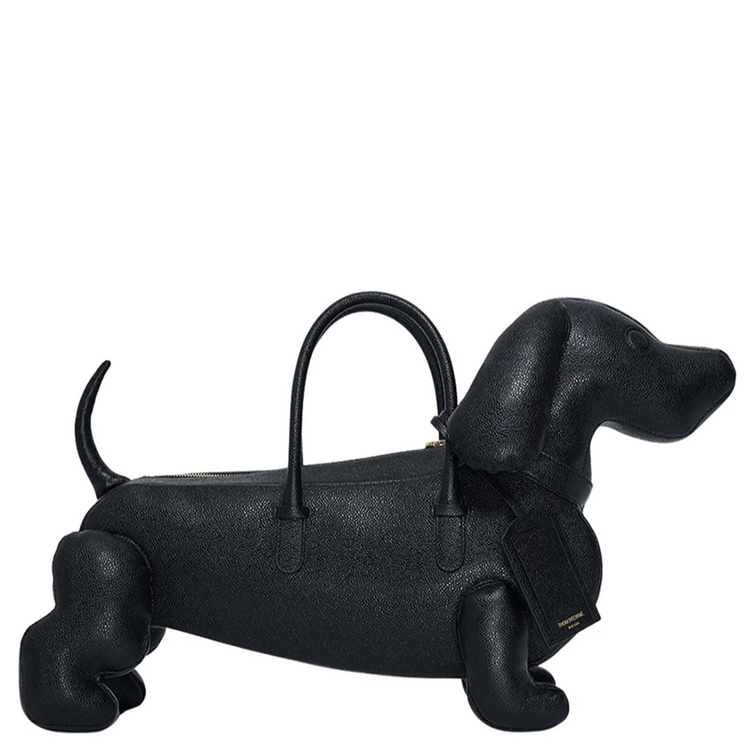 Thom Browne Hector Bag Elevate your accessory collection with this sophisticated bag with a dog-inspired silhouette, two rounded top handles, and a pebbled textured silhouette for a sleek finish. - Outer: Calf Leather 100%, Silk 100% - Lining: Polyester 100% - Width 60 cm / Height 30 cm / Handle 12 cm / Depth 15 cm - Black - Pebbled texture - Gold-tone hardware - Two rounded top handles - Top zip fastening - Leather tag - Striped lining - Internal logo patch - Made in Italy