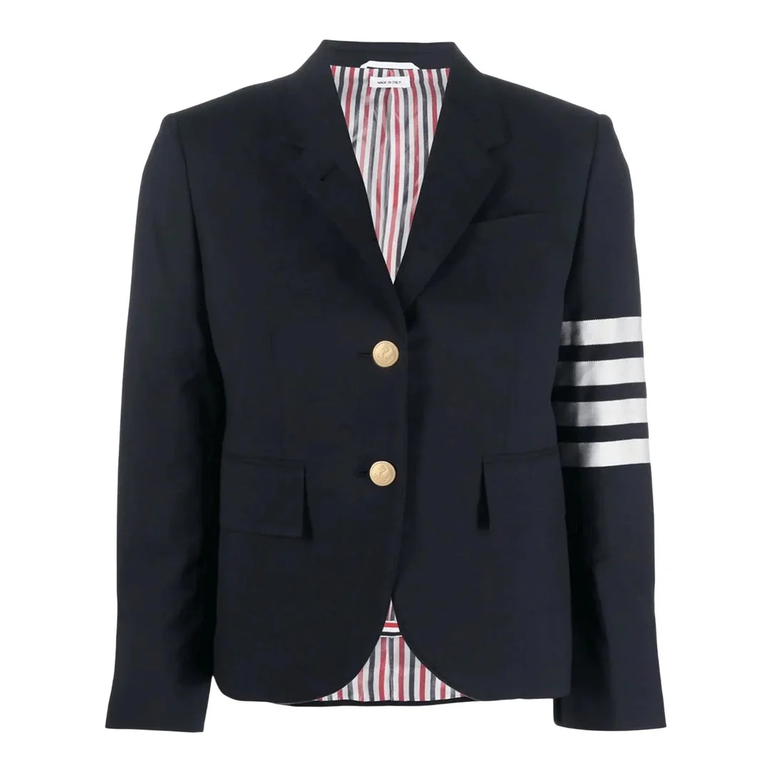 600025298NVY040 / FBC010V-06146/00/415 - Signature four-bar sleeve detail - Gold-tone branded buttons - Tricolor striped lining - Notched lapel construction - Two front flap pockets - High armhole tailoring - Fit 3 feminine silhouette - Premium wool construction The Thom Browne High Armhole Sport Coat Fit 3 delivers structured tailoring with the brand's signature feminine silhouette. Crafted from premium navy wool with signature four-bar sleeve detail and gold-tone buttons, featuring the iconic tricolor striped lining throughout. The elevated armhole construction and fitted profile create a modern interpretation of classic American suiting.