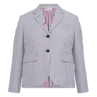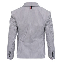 600068719GRY038 / FBC010V-00572/00/035 - High armhole construction for modern fit - Two-button front closure - Notched lapels - Chest welt pocket - Two front flap pockets - Contrasting striped lining - Structured shoulders - Premium seersucker cotton construction The Thom Browne High Armhole Sport Coat delivers tailored sophistication with the brand's signature preppy-meets-avant-garde aesthetic. Crafted from premium seersucker cotton in classic navy and white stripes, featuring contrasting red, white, and navy striped lining throughout. The high armhole construction and structured silhouette create a distinctly modern interpretation of classic American tailoring.