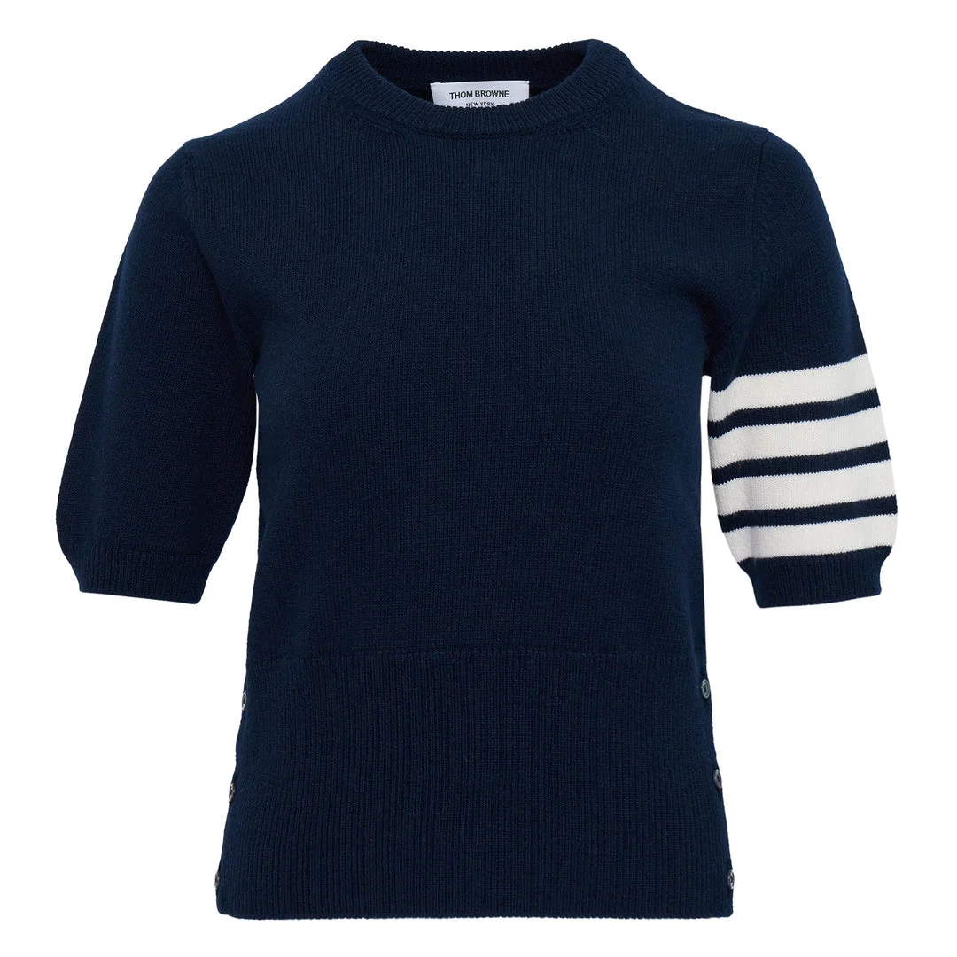 Thom Browne Intarsia Classic Jersey delivers preppy luxury with signature striped detailing and premium knit construction. Crafted from fine gauge cotton blend in navy with contrasting white intarsia stripes on the sleeve, featuring the brand's iconic four-bar motif. The classic crew neck silhouette and ribbed trims create a timeless piece that embodies Thom Browne's scholarly aesthetic.