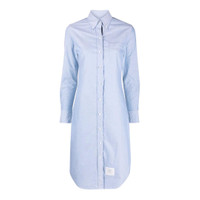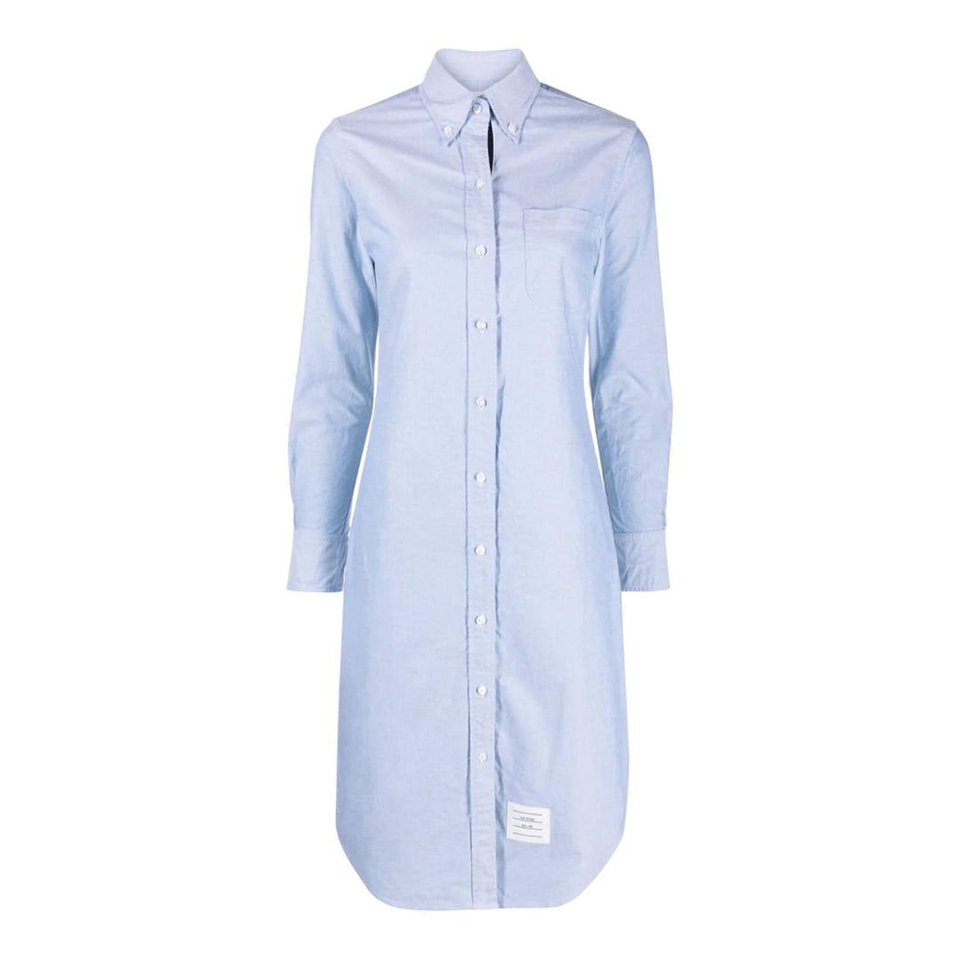 Thom Browne Knee Length Point Collar Shirt - 100% Cotton - Light Blue - Point collar - Long sleeves - Front button closure - RWB stripe grosgrain placket - Buttoned cuffs - Chest patch pocket - Name tag appliqué - Signature grosgrain loop tab - Curved hem - Knee-length