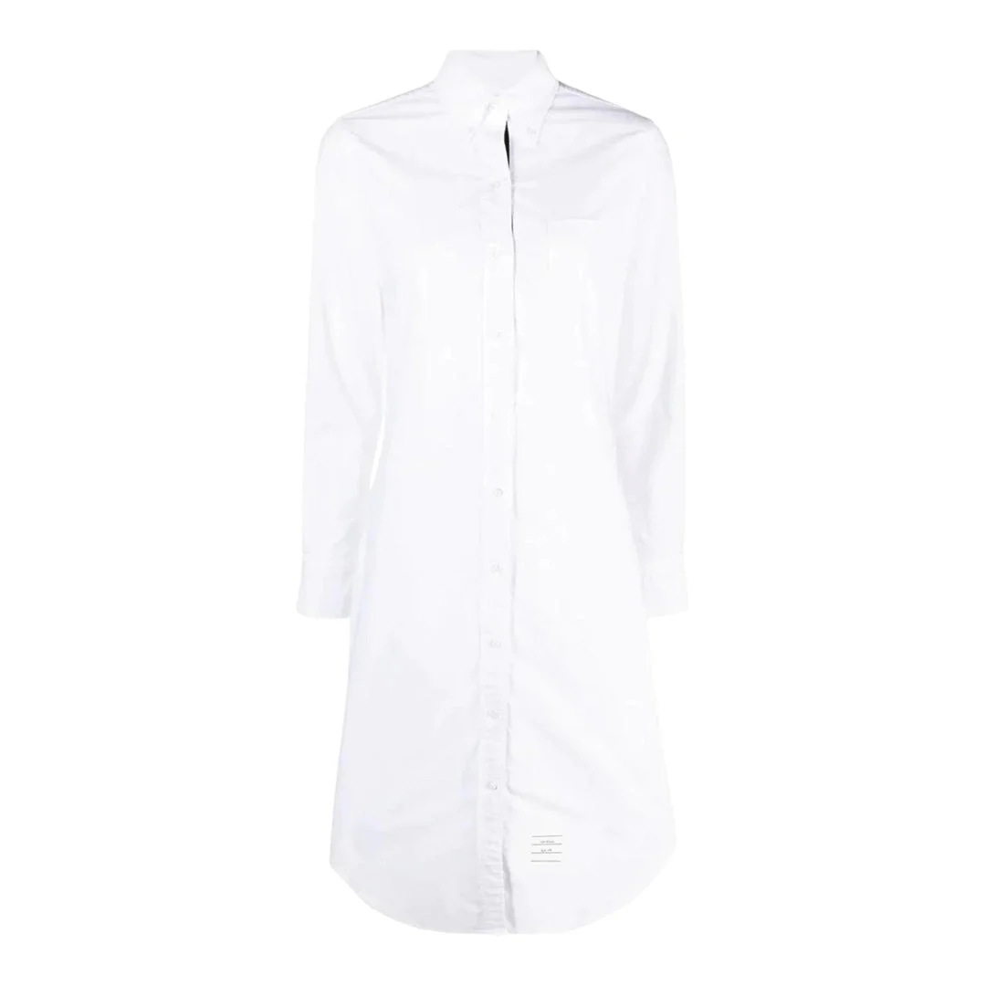 600042413WHT036 / FDS001E-F0313/00/100 - Classic point collar - Concealed button front placket - Long sleeves with barrel cuffs - Extended knee-length silhouette - Premium cotton construction - Structured tailored fit - Clean minimalist design Thom Browne Knee Length Point Collar Shirt delivers sophisticated tailoring with avant-garde proportions in classic white cotton. The extended length and structured cotton construction create a refined statement piece with the brand's signature architectural silhouette. Sharp point collar and concealed button placket showcase meticulous craftsmanship and contemporary elegance.