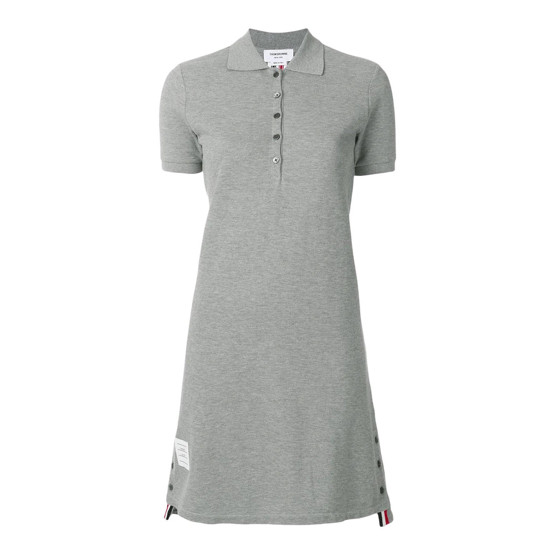 Thom Browne Knee-Length Polo Dress Thom Browne, known for his impeccable craftsmanship, occasionally draws inspiration from the sportive lifestyle, seamlessly merging it into his designs. This Knee-Length Polo Dress ensuring you ace the fashion game with confidence and flair. - 100% Cotton - Light Grey - Polo collar - Short sleeves - Front button placket - Piqué weave - Signature RWB strip - Signature grosgrain loop tab - Straight hem - Above-knee length