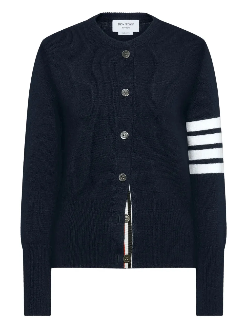The Thom Browne LNY Jersey Intarsia Classic delivers sophisticated American luxury with signature preppy-meets-tailored craftsmanship. Crafted from premium knitted jersey in navy with iconic white four-bar stripe detailing on the sleeve, featuring button-front closure and ribbed trims. The signature Thom Browne proportions and intarsia knit construction create a refined statement piece for contemporary wardrobes.