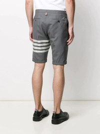 Thom Browne Low Rise Shorts Thom Browne's medium grey wool suiting shorts in 4-bar plain weave exude comfort and casual sophistication. The shorts are tailored for a stylish yet relaxed fit, making them a versatile wardrobe staple for any fashion-forward individual. - 100% Wool - Grey - Low-Rise - French Fly - Button-Front - Jetted Hip Pockets - Engineered 4-Bar Stripe - Adjustable Side Tabs - Signature Grosgrain Loop Tab - Skinny Fit