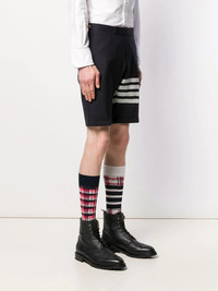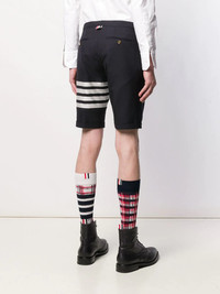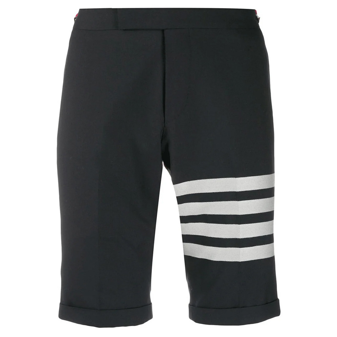 Thom Browne Low Rise Shorts Fit 3 In Engineer Thom Browne's low-rise wool suiting shorts in 4-bar plain weave exude both comfort and casual sophistication. Tailored for a stylish yet regular fit, these shorts become versatile wardrobe staples for any fashion-forward individual. - 100% Wool - Navy - Low-rise - French fly and button fastening - Two side pockets - Jetted hip pockets - Engineered 4-bar stripe - Adjustable side tabs - Signature grosgrain loop tab - Regular fit