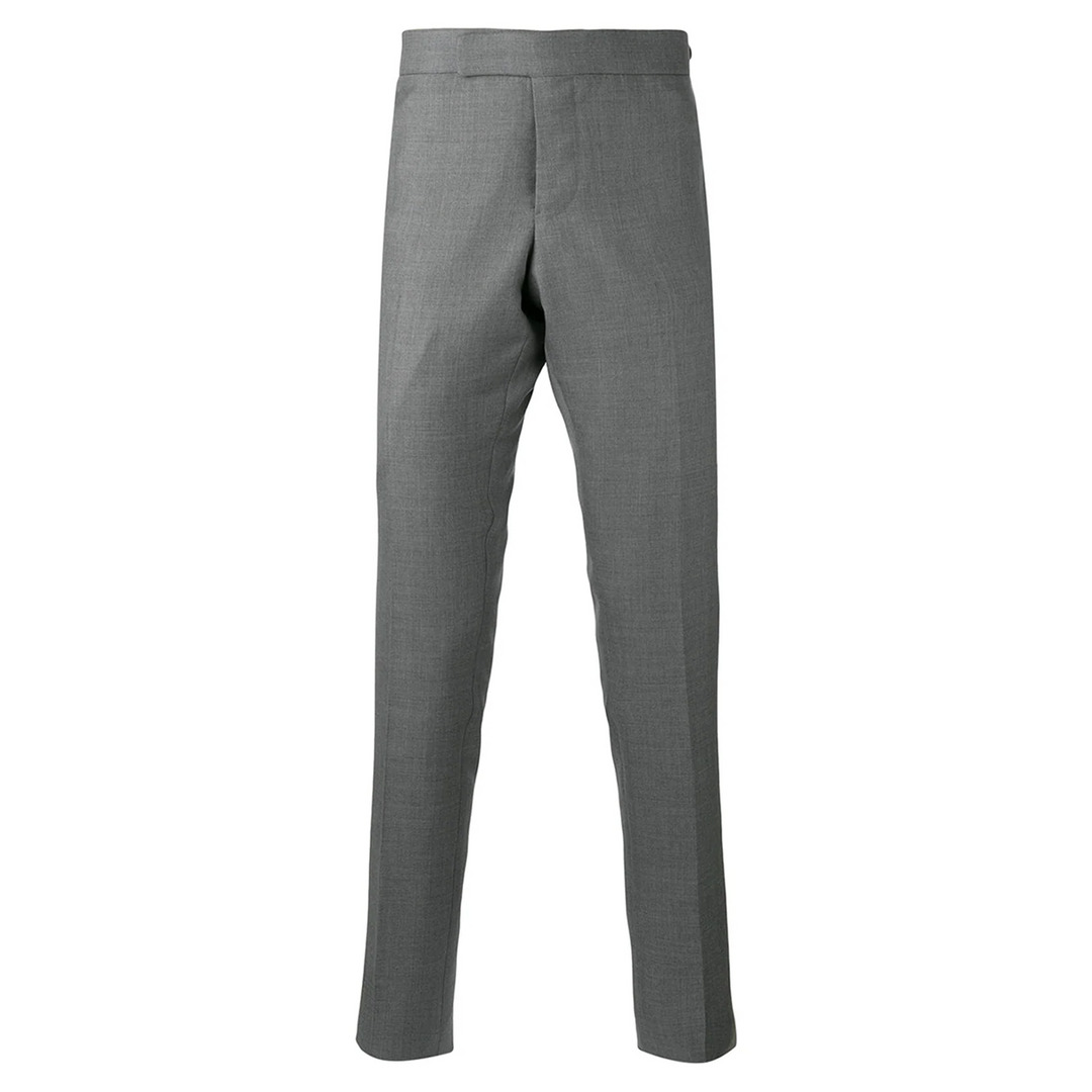 Thom Browne Low Rise Skinny Side Tab Trousers Crafted from exquisite fabric, these sleek bottoms boast a flattering fit that effortlessly contours your silhouette. The subtle side tab detailing adds a touch of charm, while the low rise design exudes contemporary elegance. Elevate your wardrobe with this timeless piece. - 100% Wool  - Grey - Low rise - Skinny side tab - Tab front closure - Flat front - Slip side pockets - Button-fastening back welt pockets - Adjustable buttoned side tabs - Creased legs - Signature striped grosgrain loop tab at back waist