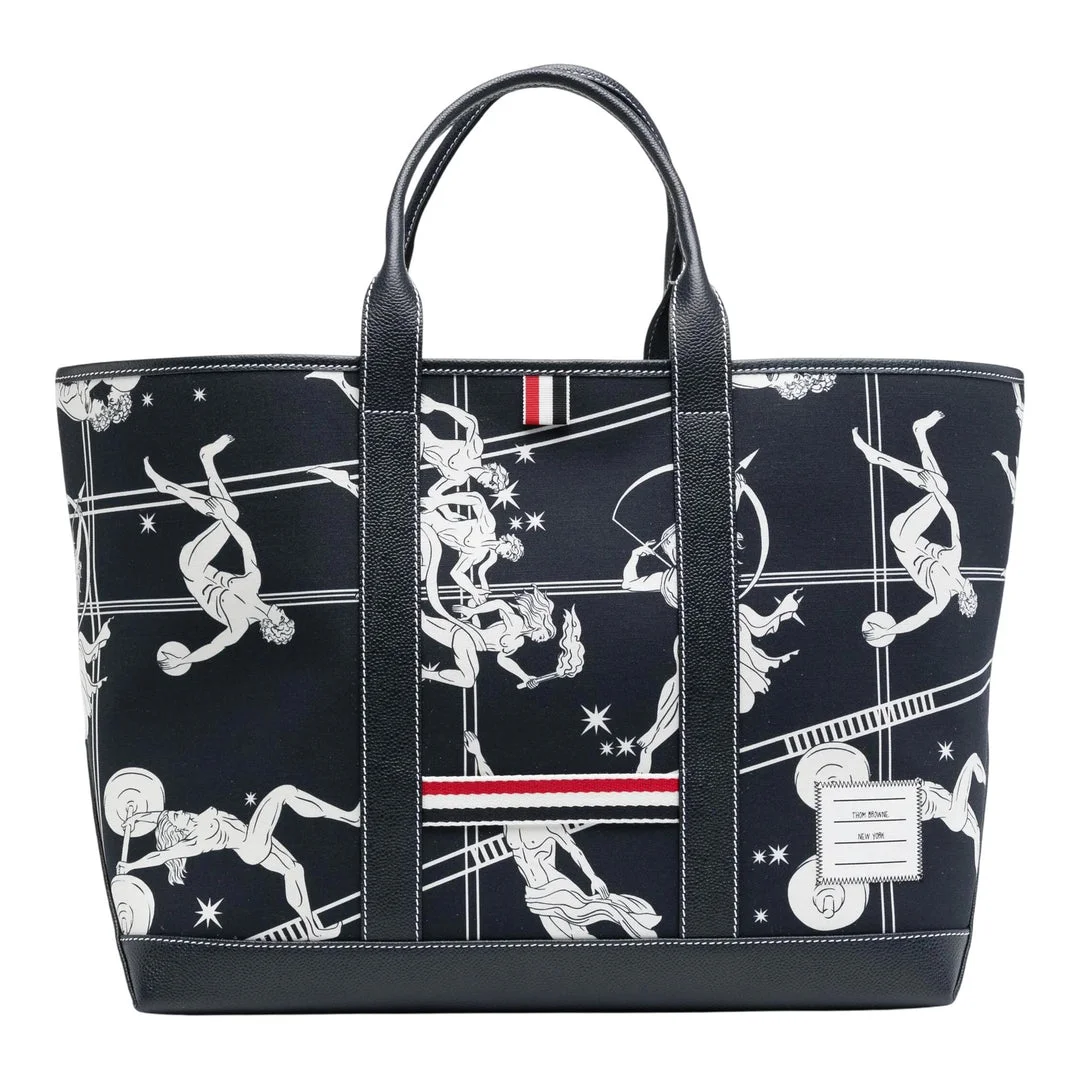 300046057NVY-NS / S5MAG389A-F0891/00/415 - Navy canvas construction with white leather trim - Dual leather handles - Signature tricolor stripe detailing - Nautical athletic motif print - Structured tote silhouette - Interior compartments - Unisex design Thom Browne Medium Tool Tote Unisex delivers sophisticated functionality with signature nautical-inspired design elements. Crafted from premium navy canvas with contrasting white leather trim, featuring the brand's iconic athletic motifs and tricolor stripe detailing. The structured construction and dual handle design create a refined carryall perfect for contemporary urban lifestyle.