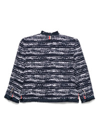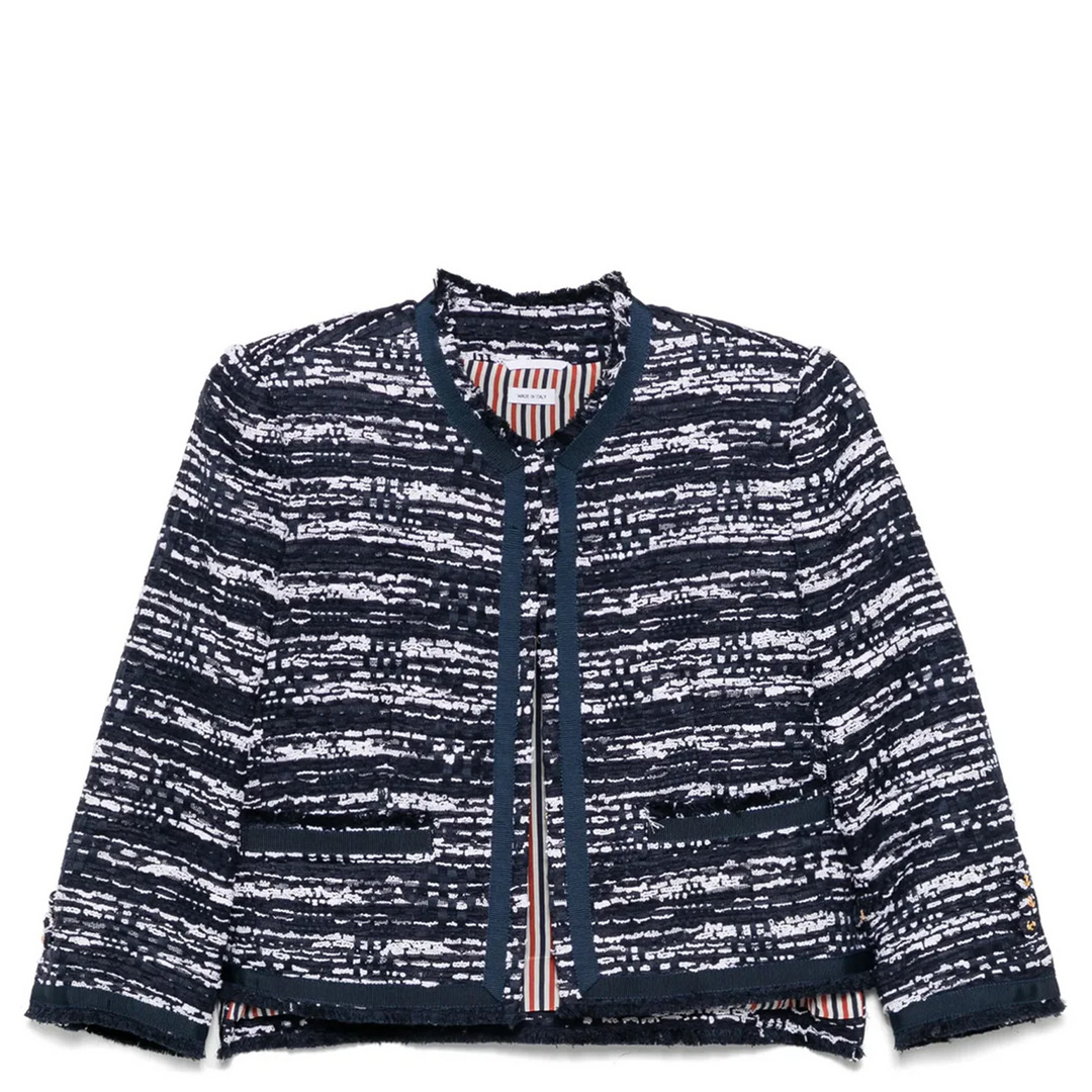 600060037NVY042 / PS25-FBC924T-F0827/00/415 - Open front design - Drop back construction - Three-quarter sleeves - Frayed edge finishing - Signature tricolor ribbon trim - Melange tulle yarn tweed fabric - Relaxed fit The Thom Browne Melange Tweed Cardigan Jacket delivers sophisticated layering with architectural construction and signature brand detailing. Crafted from luxurious melange tulle yarn tweed in navy and white, featuring a structured drop-back silhouette and frayed edge finishing. The open-front design and signature tricolor ribbon trim create a refined statement piece for contemporary wardrobes.