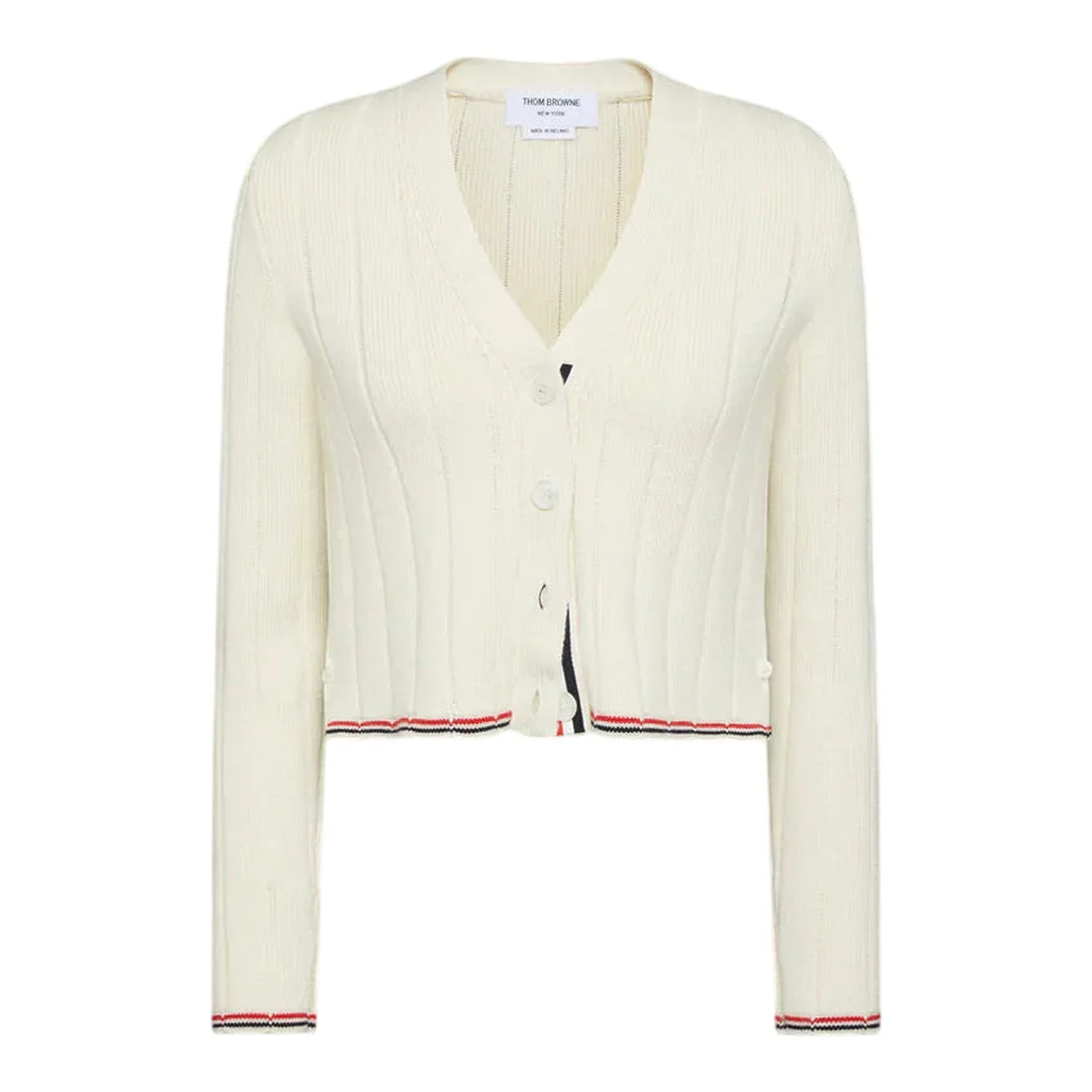 600068839WHT040 / PF25-FKC663A-Y1024/00/100 - 100% merino wool construction - Cable-knit texture throughout - V-neckline with button closure - Signature tricolor stripe trim - Cropped fit - Ribbed cuffs and hem Thom Browne Merino Wool V Neck Cardigan delivers preppy sophistication with signature American luxury tailoring. Crafted from premium merino wool in classic cream, featuring the brand's iconic tricolor stripe detailing at hem and cuffs. The cropped silhouette and cable-knit construction embody Thom Browne's refined schoolboy aesthetic.