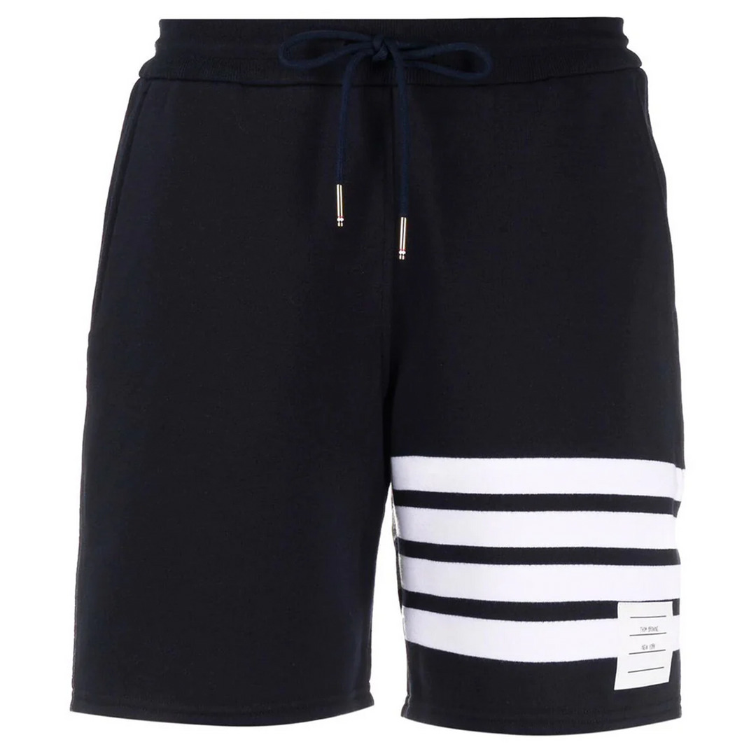 Thom Browne Mid Thigh Shorts Celebrating two of the label's most renowned motifs, these Mid Thigh Shorts showcase a navy blue hue that allows the signature 4-bar stripe and iconic Signature grosgrain loop tab to stand out, creating a recognizable and distinct appearance.
