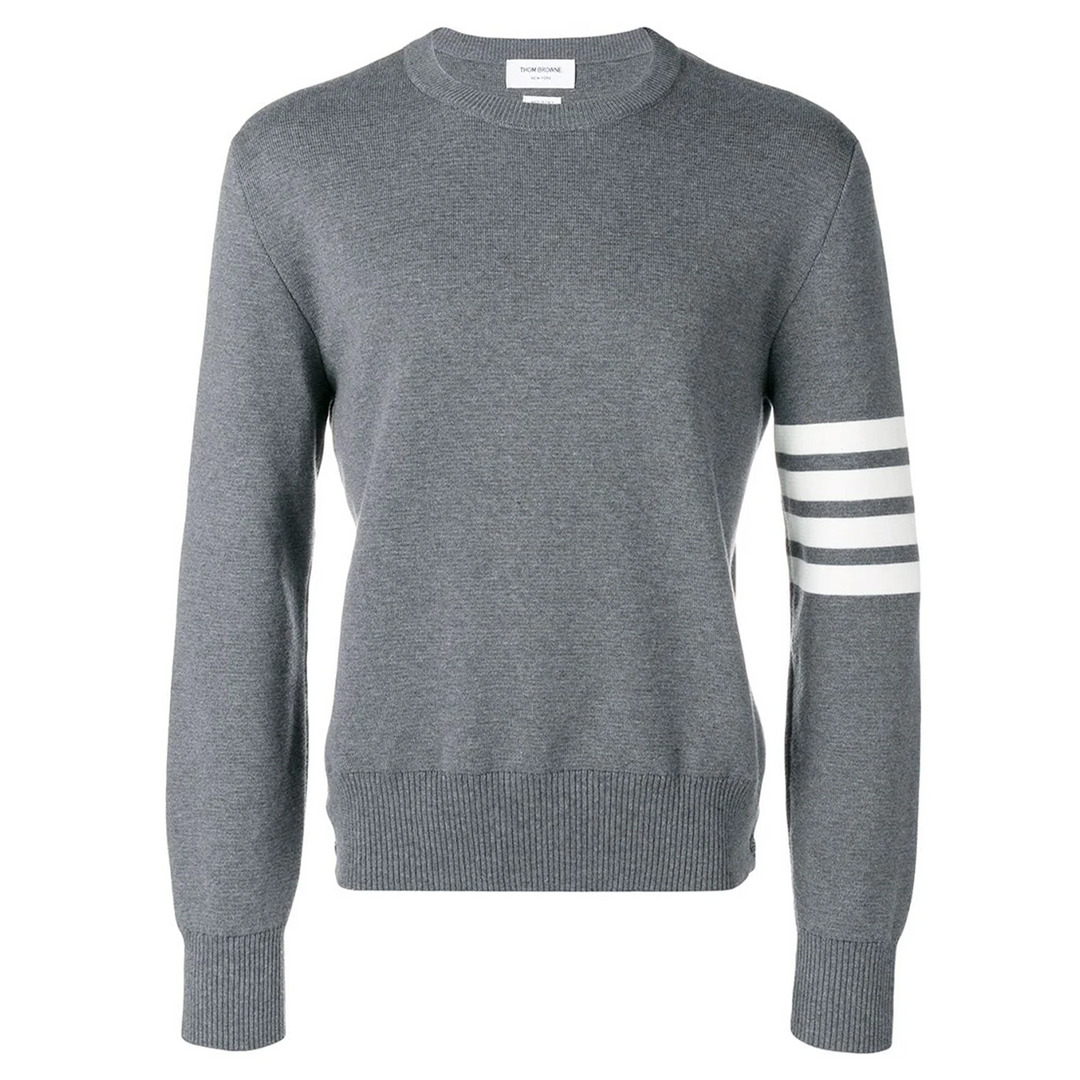 Thom Browne Milano Stitch Crew Neck Pullover Expertly crafted from premium grey cotton, this crew-neck jumper by Thom Browne boasts a classic, timeless design. Minimalist in its approach, the piece is subtly adorned with the iconic 4-Bar emblem, which elegantly envelops the left sleeve, providing a touch of the brand's signature style. - 100% Cotton - Grey - Crew neck - Long sleeves - Fine knit - Ribbed-knit edge - Signature 4-Bar stripe - Ribbed neck, hem and cuff - Side split hem - Button cuff - Straight hem - Hem hits at hip