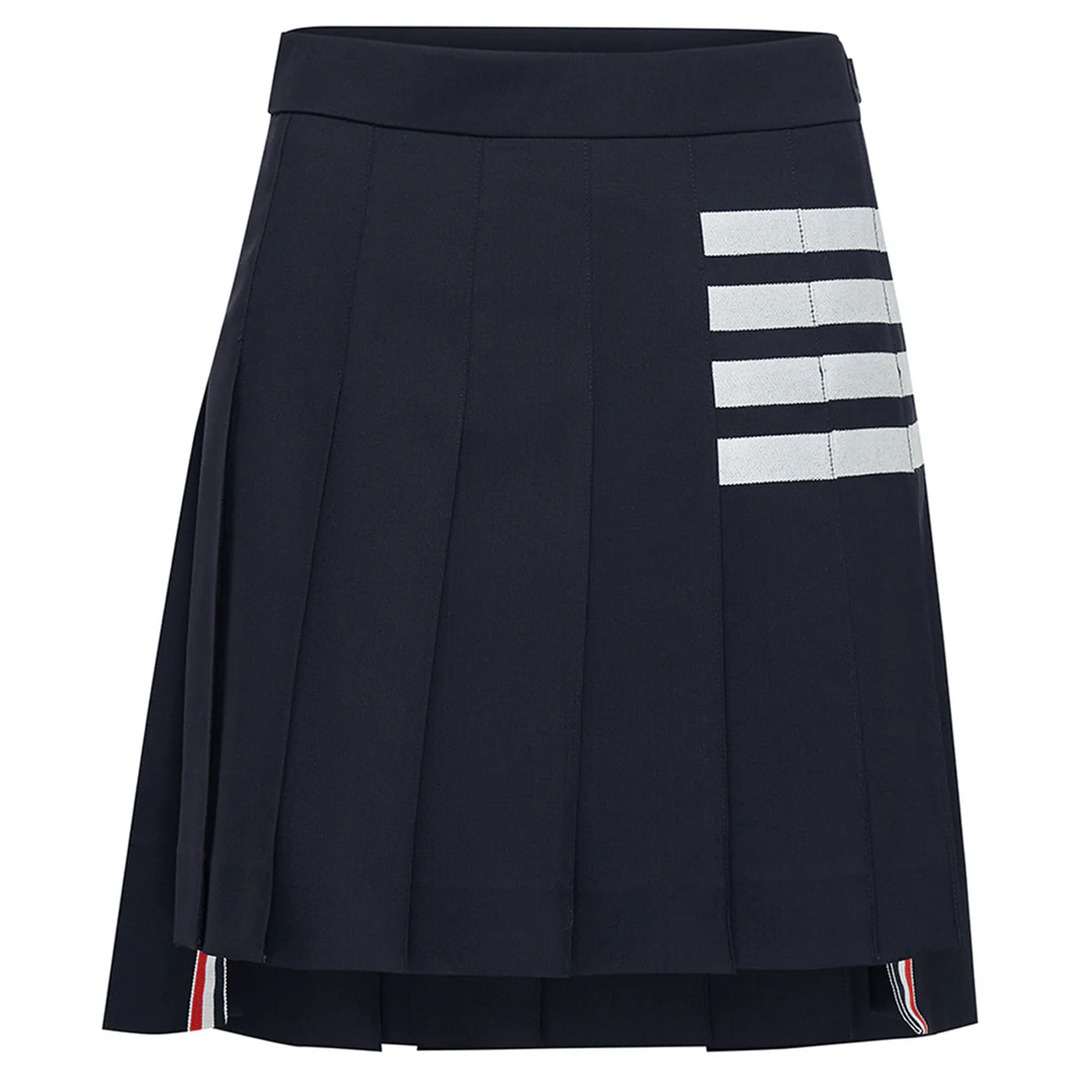 Thom Browne Mini Dropped Back Pleated Skirt Staying true to its penchant for preppy aesthetics, Thom Browne presents this pleated mini skirt punctuated with its signature 4-bar stripe print. Crafted from soft fabric and finished off with an asymmetric hem, this piece styles effortlessly with your everyday separates to create a youthful allure. - 100% Wool - Navy - Signature 4-Bar stripe - High waist - Side buckle fastening - Pleated design - High low hem - Short length - Signature grosgrain loop tab - Made in Italy